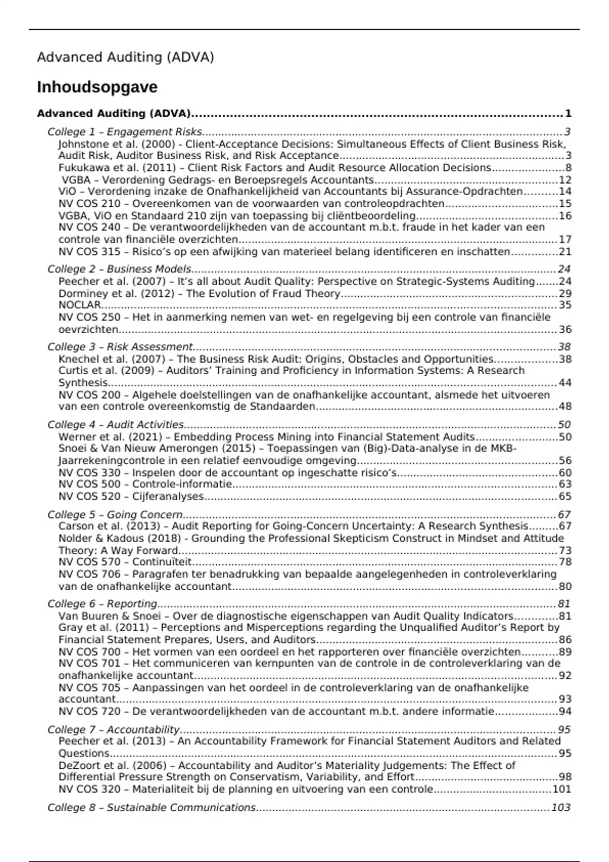 Betreft een uitgebreide samenvatting van Advanced Auditing (ADVA) gegeven in het eerste jaar van de Master Accountancy aan Nyenrode. In deze samenvatting worden alle relevante artikelen en standaarden behandelt. Hier zijn tevens college aantekeningen en overeenkomsten/verschillen tussen de artikelen en standaarden toegevoegd.