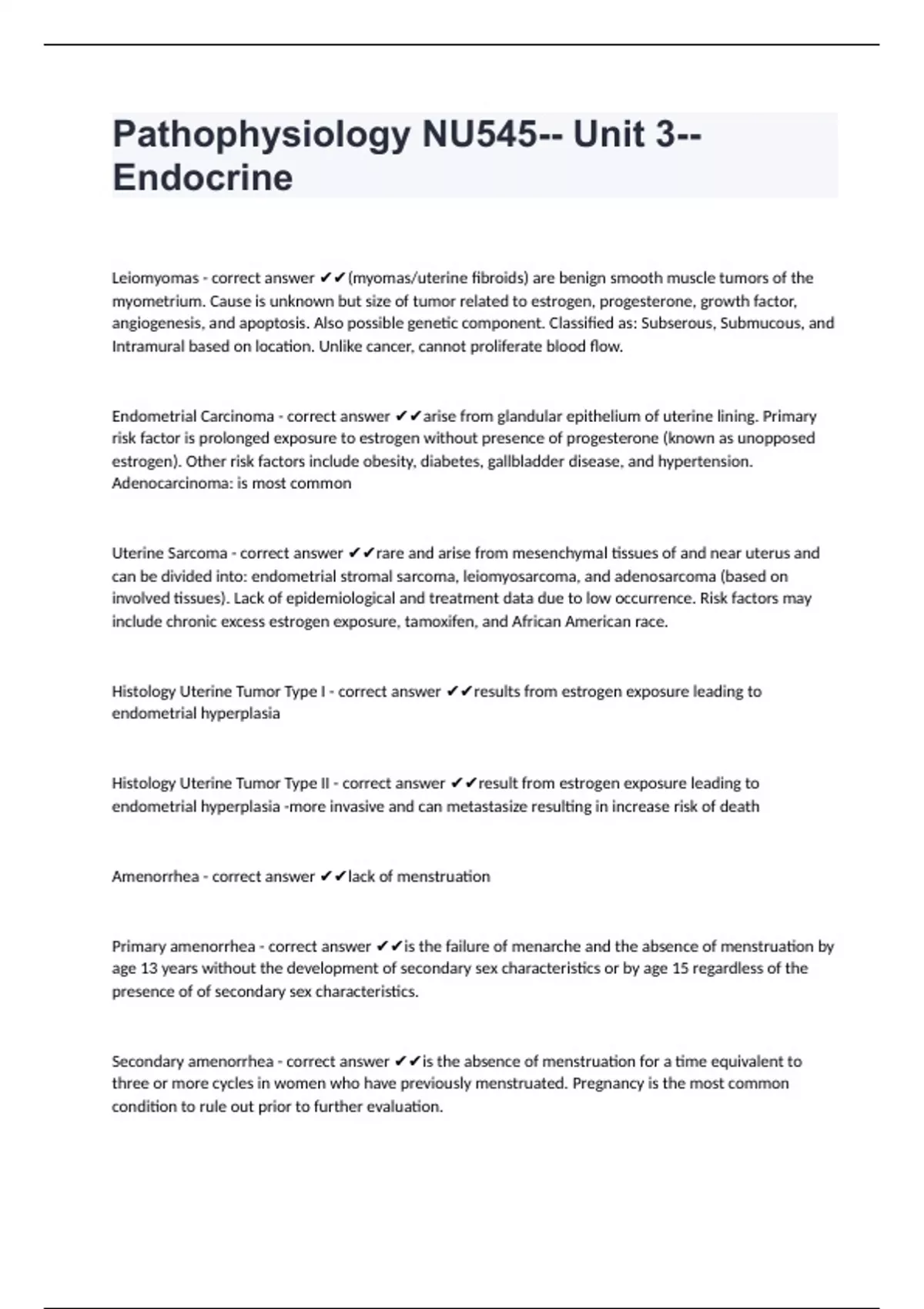 Pathophysiology NU545-- Unit 3--Endocrine well answered already passed