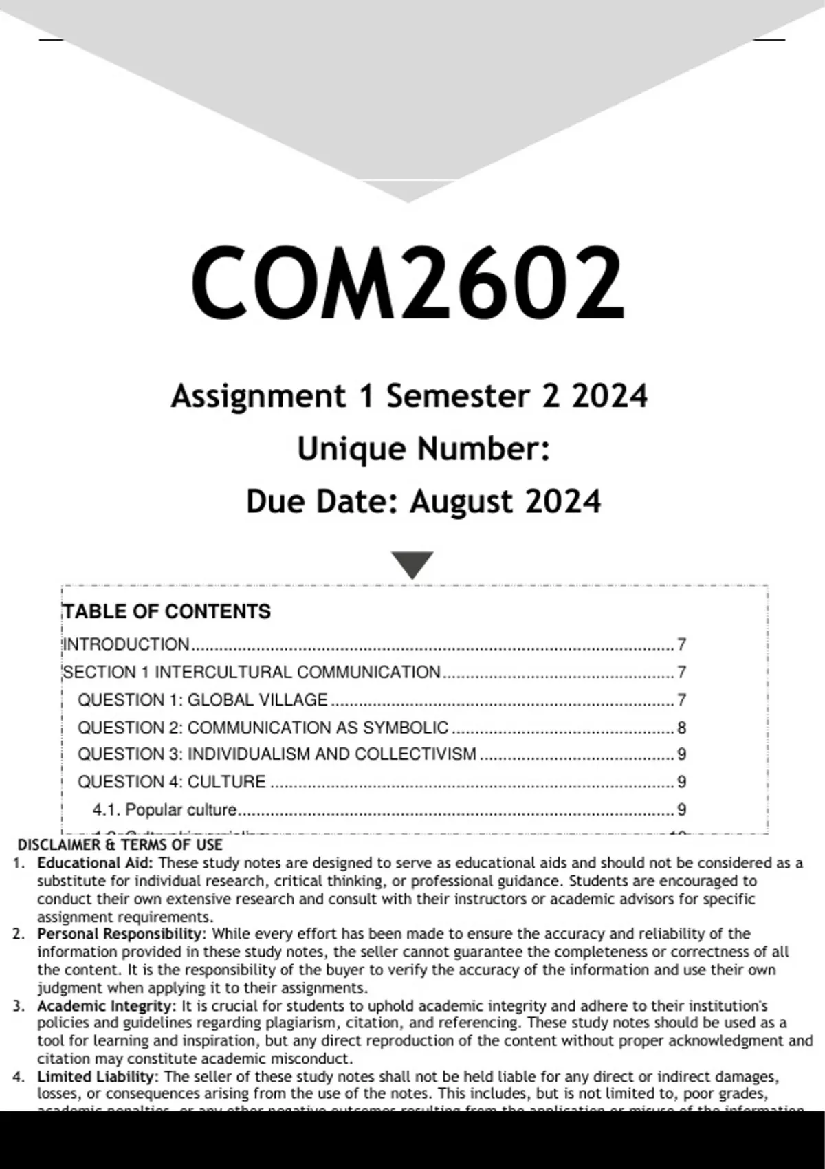 Well-structured COM2603 Assignment 1 (ANSWERS) Semester 2 2024 - DISTINCTION GUARANTEED. (DETAILED ANSWERS - DISTINCTION GUARANTEED!)..... SECTION 1 INTERCULTURAL COMMUNICATION QUESTION 1 Explain the concept of ‘global village’ and discuss the role of technology in facilitating human communication. (10) QUESTION 2 Discuss the view of communication as symbolic and provide two examples of symbolic communication from your own culture. (5) QUESTION 3 Provide an explanation of Individualism and Collectivism and give relevant examples. (5) QUESTION 4 Read the following scenario and answer the questions that follow. On a bursting Johannesburg Street, a group of friends from various countries gather around a vibrant graffiti wall adorned with references to international music, films, and TV shows. They engage in animated conversations, blending languages and dialects, as they exchange recommendations, critique artistic choices, and enthusiastically celebrate the universality of their shared cultural experiences. 4.1 What is popular culture? (5) 4.2 Define cultural imperialism and give one example thereof. (5) Sub-total: [30] 22 SECTION 2 DEVELOPMENT COMMUNICATION QUESTION 1 1.1 Dependency theory’s criticism of the dominant paradigm gave rise to demands for a restructuring of the world’s economic and communication systems. Define the New World Information and Communication Order (NWICO) and discuss its aims. (5) 1.2 Provide a discussion of media imperialism, with relevant examples from the media. (5) 1.3 Discuss the role played by multinational/transnational corporations to advance the new kind of imperialism and provide two examples of these types of corporations. (5) QUESTION 2 2.1 Briefly discuss the idea of participatory communication. (3) 2.2 Define participatory research. (2) 2.3 Discuss the assumptions of participatory research. (5) 2.4 Describe how you would conduct participatory research in your community by focusing on the three steps of the participatory research process. (5) Sub-total: [30] SECTION 3 HEALTH COMMUNICATION QUESTION 1 1.1 What does empowerment in the healthcare provider (HCP)-patient relationship entail? (3) 1.2 Define control in the medical setting between the healthcare provider (HCP)-patient relationship. Thereafter, name the two types of control. (4) 1.3 How can HCPs aim to empower patients? (6) QUESTION 2 Read the scenario below and answer the questions that follow. A newly innovated exercise app for healthy living is being introduced to a community in the KwaZulu-Natal province. Research has indicated that both males and females in this community are keen to exercise from the comfort of their homes. While working from home during the COVID-19 lockdown, this community has experienced mental health challenges and feel that exercise will help them de-stress. As a healthcare communication planner, you have been tasked with the promotion of the new exercise app in this selected community. Using the theoretical framework of the Diffusion of Innovation Theory, explain the following. 2.1 Explain the four steps of the Diffusion of Innovation Theory and explain how you would ensure the diffusion of the health app in this community in practice. (3x4=12) 2.2 Using the exchange approach theoretical framework, explain how you would voluntarily offer 1 month’s free trial access to the app in exchange for people’s attendance at your launch (to promote sales of the exercise app to the community).