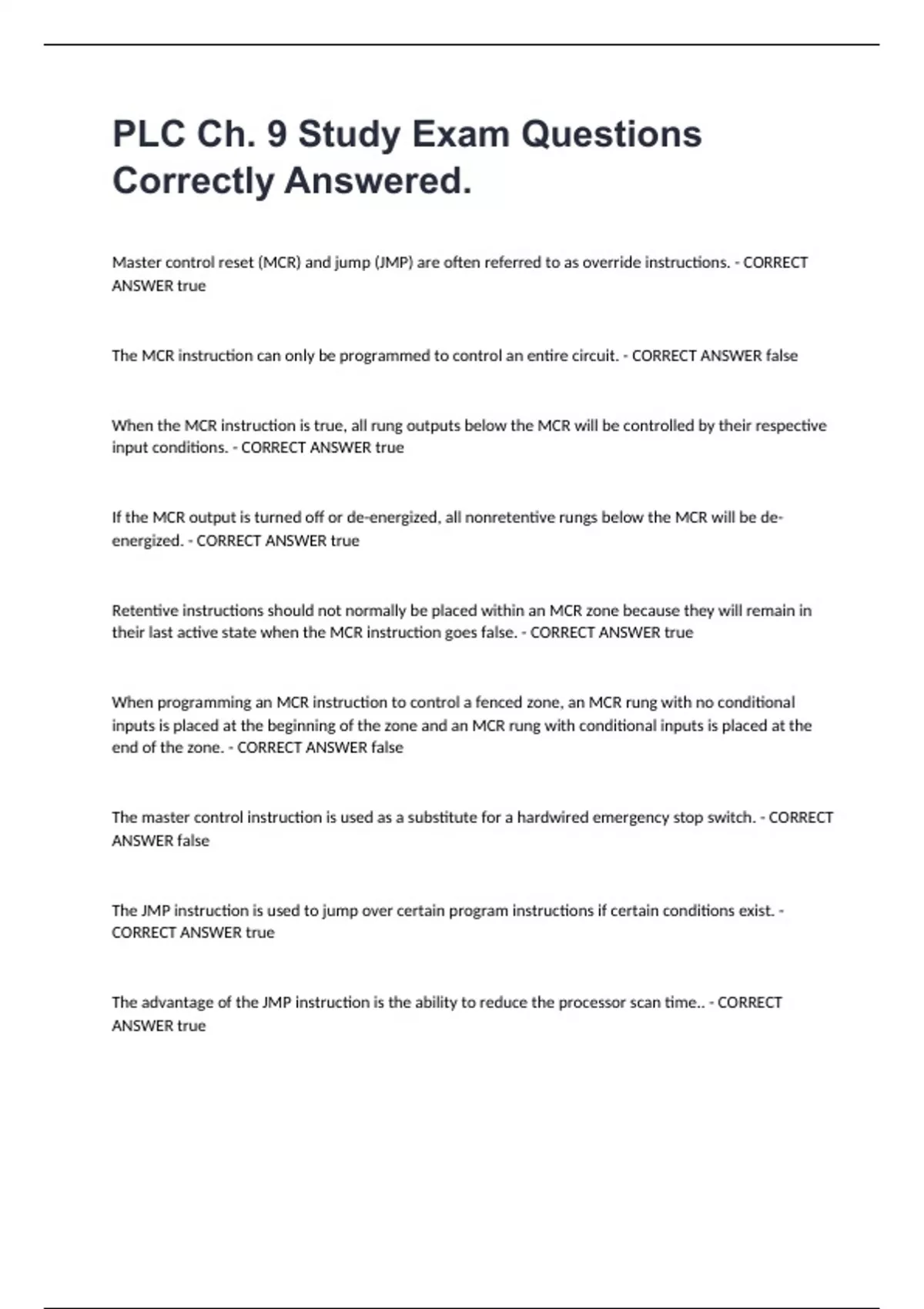 PLC Ch. 9 Study Exam Questions Correctly Answered. Master control reset (MCR) and jump (JMP) are often referred to as override instructions. - CORRECT ANSWER true The MCR instruction can only be programmed to control an entire circuit. - CORRECT ANSWER false When the MCR instruction is true, all rung outputs below the MCR will be controlled by their respective input conditions. - CORRECT ANSWER true If the MCR output is turned off or de-energized, all nonretentive rungs below the MCR will be de-energized. - CORRECT ANSWER true Retentive instructions should not normally be placed within an MCR zone because they will remain in their last active state when the MCR instruction goes false. - CORRECT ANSWER true When programming an MCR instruction to control a fenced zone, an MCR rung with no conditional inputs is placed at the beginning of the zone and an MCR rung with conditional inputs is placed at the end of the zone. - CORRECT ANSWER false The master control instruction is used as a substitute for a hardwired emergency stop switch. - CORRECT ANSWER false The JMP instruction is used to jump over certain program instructions if certain conditions exist. - CORRECT ANSWER true The advantage of the JMP instruction is the ability to reduce the processor scan time.. - CORRECT ANSWER true