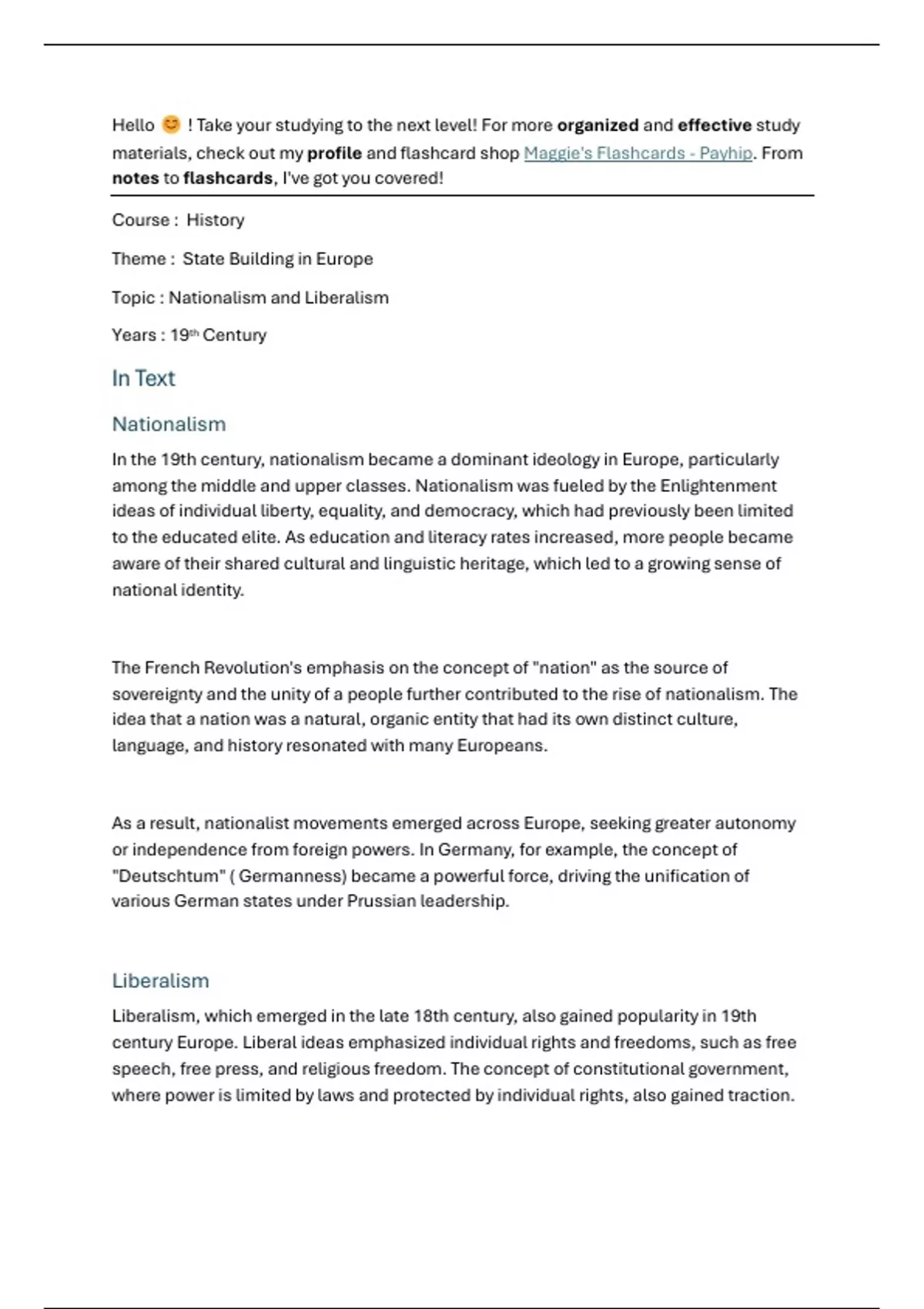 Welcome ;) I'm Maggie, a dedicated and high-achieving student with an impressive 93+% average overall. I'm excited to share my comprehensive notes on various courses and topics with you! My notes are organized into three main sections: • In Text: Detailed explanations of key concepts and information, written in a clear and concise manner. • As Flashcards: A quiz-style section where you can test your knowledge with Q&A pairs, helping you reinforce your understanding and retention of the material. • Basic Terms: A glossary of essential terms and definitions relevant to each topic, providing a quick reference guide for easy review. In addition to these notes, I've also compiled extensive flashcard sets for each topic, which are available on both Quizlet and RemNote. These flashcards are designed to help you absorb and recall key concepts quickly and efficiently. To access my extensive collection of flashcards, simply visit my online shop by clicking: As a top-performing student with a strong track record of academic success, I've developed a unique approach to learning that emphasizes clarity, organization, and effective note-taking. My notes reflect this approach, making it easy for you to follow along and stay on top of your studies. Whether you're looking for in-depth explanations, model essays, or quick reference guides, my notes have got you covered. With this comprehensive resource, you'll be well-prepared to excel in your studies and achieve your academic goals. Feel free to reach out to me for more information on any of the courses or topics I've covered. As a student who has consistently achieved high grades, I'm confident that my notes will help you achieve similar success <3