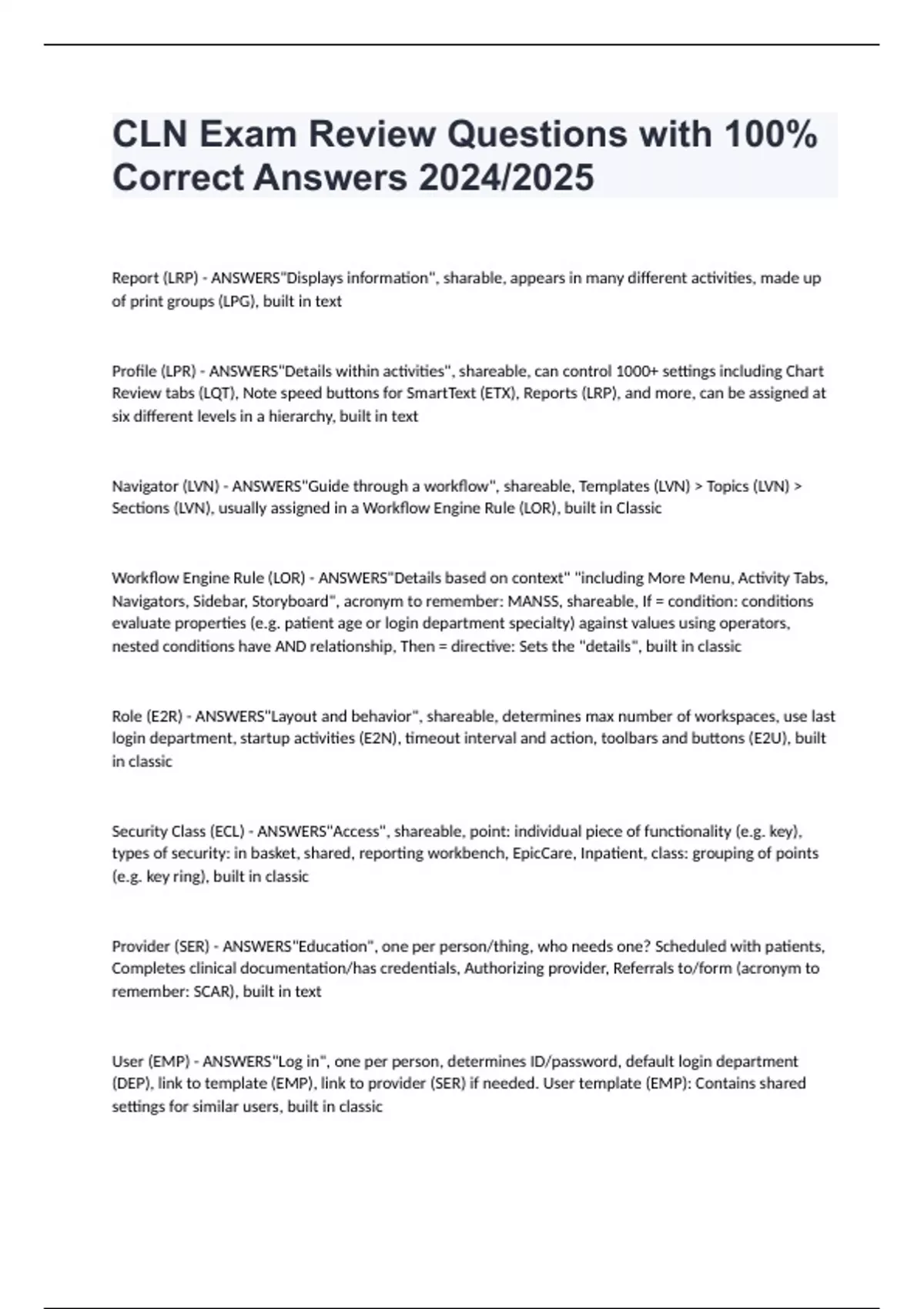 CLN Exam Review Questions with 100% Correct Answers 2024/2025 Report (LRP) - ANSWERS"Displays information", sharable, appears in many different activities, made up of print groups (LPG), built in text Profile (LPR) - ANSWERS"Details within activities", shareable, can control 1000+ settings including Chart Review tabs (LQT), Note speed buttons for SmartText (ETX), Reports (LRP), and more, can be assigned at six different levels in a hierarchy, built in text Navigator (LVN) - ANSWERS"Guide through a workflow", shareable, Templates (LVN) > Topics (LVN) > Sections (LVN), usually assigned in a Workflow Engine Rule (LOR), built in Classic Workflow Engine Rule (LOR) - ANSWERS"Details based on context" "including More Menu, Activity Tabs, Navigators, Sidebar, Storyboard", acronym to remember: MANSS, shareable, If = condition: conditions evaluate properties (e.g. patient age or login department specialty) against values using operators, nested conditions have AND relationship, Then = directive: Sets the "details", built in classic Role (E2R) - ANSWERS"Layout and behavior", shareable, determines max number of workspaces, use last login department, startup activities (E2N), timeout interval and action, toolbars and buttons (E2U), built in classic Security Class (ECL) - ANSWERS"Access", shareable, point: individual piece of functionality (e.g. key), types of security: in basket, shared, reporting workbench, EpicCare, Inpatient, class: grouping of points (e.g. key ring), built in classic Provider (SER) - ANSWERS"Education", one per person/thing, who needs one? Scheduled with patients, Completes clinical documentation/has credentials, Authorizing provider, Referrals to/form (acronym to remember: SCAR), built in text User (EMP) - ANSWERS"Log in", one per person, determines ID/password, default login department (DEP), link to template (EMP), link to provider (SER) if needed. User template (EMP): Contains shared settings for similar users, built in classic