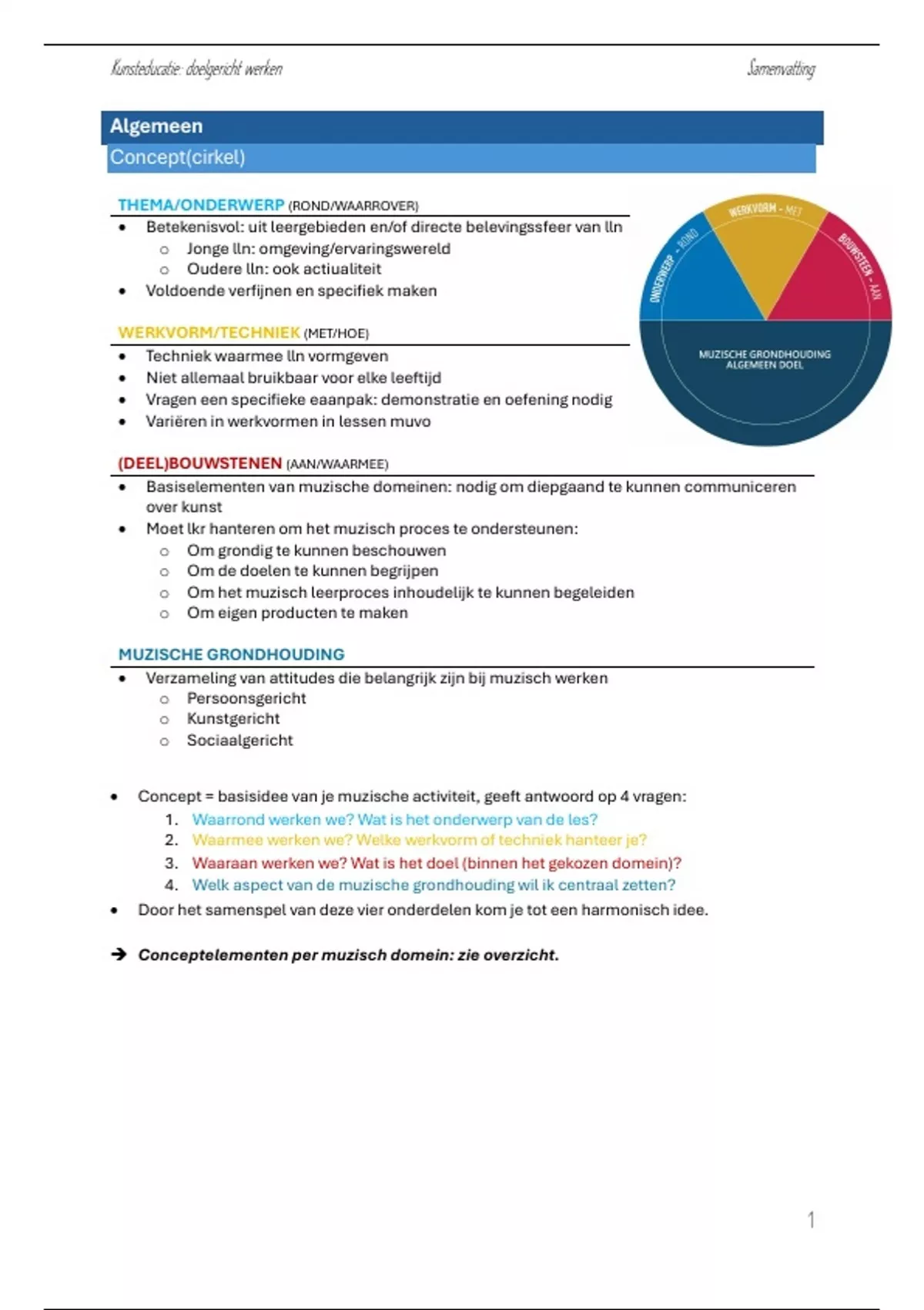 Dit document van 26 pagina's bevat een samenvatting van de leerstof van het OPO kunsteducatie doelgericht werken. Het is een combinatie van eigen notities tijdens de lessen en de inhoud uit Zeppelin. Vertrekkend vanuit de conceptcirkels met bijhorende thema's, werkvormen en bouwstenen aangevuld met extra informatie. Deze samenvatting werd gemaakt in het academiejaar waarbij de lessen werden gegeven door K. Crul, H. Michiels en S. Dewitte.