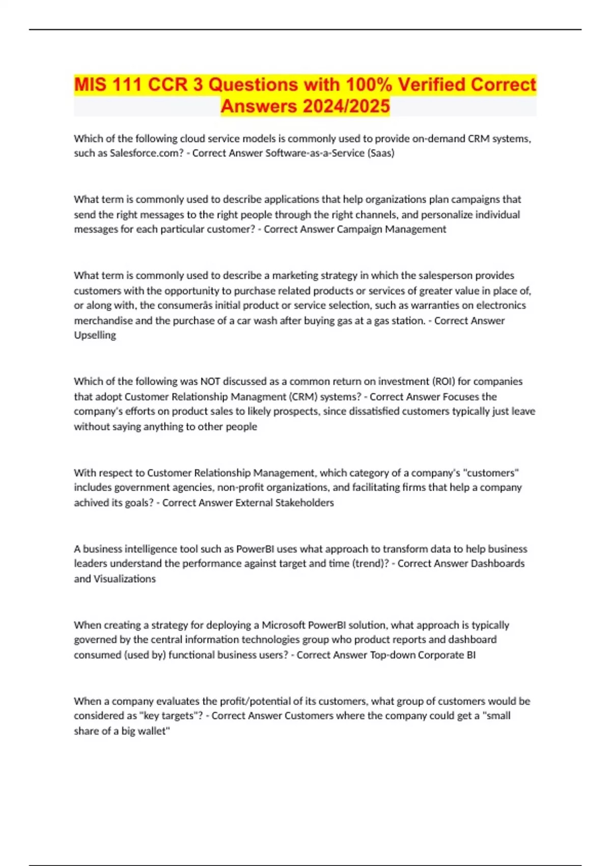 MIS 111 CCR 3 Questions with 100% Verified Correct Answers 2024/2025 Which of the following cloud service models is commonly used to provide on-demand CRM systems, such as S? - Correct Answer Software-as-a-Service (Saas) What term is commonly used to describe applications that help organizations plan campaigns that send the right messages to the right people through the right channels, and personalize individual messages for each particular customer? - Correct Answer Campaign Management What term is commonly used to describe a marketing strategy in which the salesperson provides customers with the opportunity to purchase related products or services of greater value in place of, or along with, the consumerâs initial product or service selection, such as warranties on electronics merchandise and the purchase of a car wash after buying gas at a gas station. - Correct Answer Upselling Which of the following was NOT discussed as a common return on investment (ROI) for companies that adopt Customer Relationship Managment (CRM) systems? - Correct Answer Focuses the company's efforts on product sales to likely prospects, since dissatisfied customers typically just leave without saying anything to other people With respect to Customer Relationship Management, which category of a company's "customers" includes government agencies, non-profit organizations, and facilitating firms that help a company achived its goals? - Correct Answer External Stakeholders A business intelligence tool such as PowerBI uses what approach to transform data to help business leaders understand the performance against target and time (trend)? - Correct Answer Dashboards and Visualizations When creating a strategy for deploying a Microsoft PowerBI solution, what approach is typically governed by the central information technologies group who product reports and dashboard consumed (used by) functional business users? - Correct Answer Top-down Corporate BI When a company evaluates the profit/potential of its customers, what group of customers would be considered as "key targets"? - Correct Answer Customers where the company could get a "small share of a big wallet" Which of the following "Marketing Principles" considers the issue of resource constraints and the importance of understanding the marginal benefit and costs associated with every incremental dollar invested i