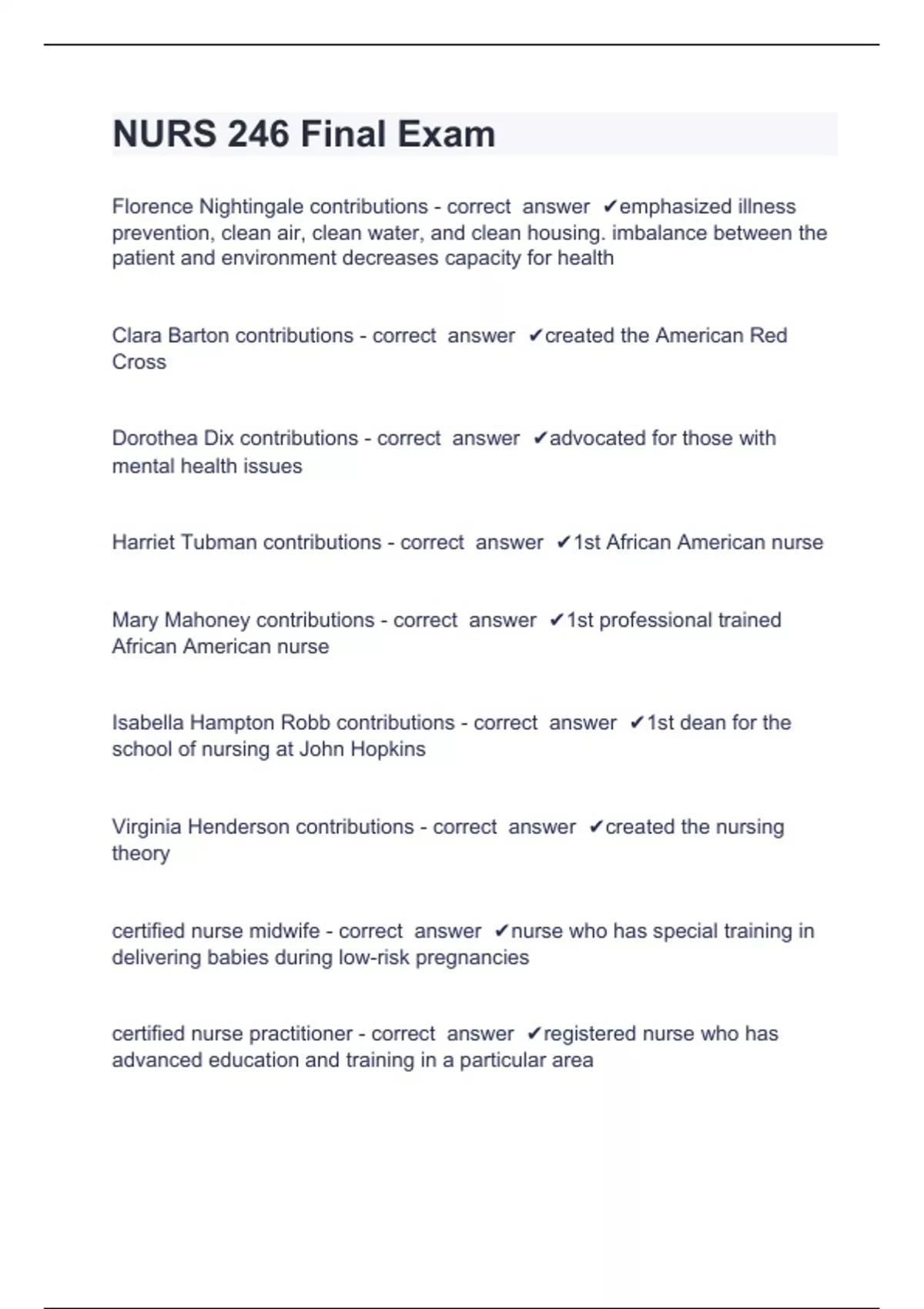 certified nurse practitioner - correct answer ✔registered nurse who has advanced education and training in a particular area clinical nurse specialist - correct answer ✔Expert clinician in a specialized area of practice