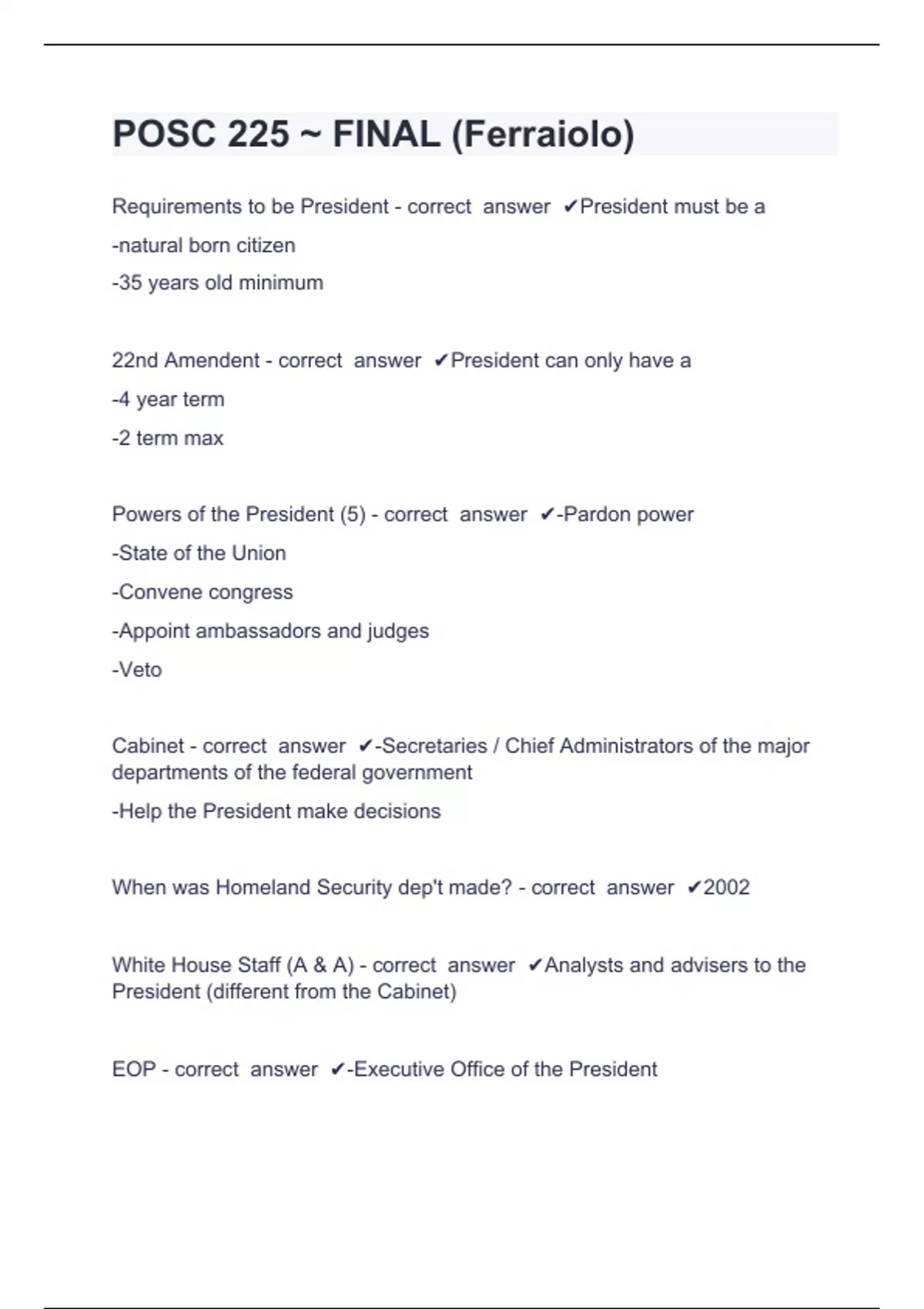 POSC 225 Nightingale College Question and answers 100% correct POSC 225 ~ FINAL (Ferraiolo) Requirements to be President - correct answer President must be a -natural born citizen -35 years old minimum 22nd Amendent - correct answer President can only have a -4 year term -2 term max Powers of the President (5) - correct answer -Pardon power -State of the Union -Convene congress -Appoint ambassadors and judges -Veto Cabinet - correct answer -Secretaries / Chief Administrators of the major departments of