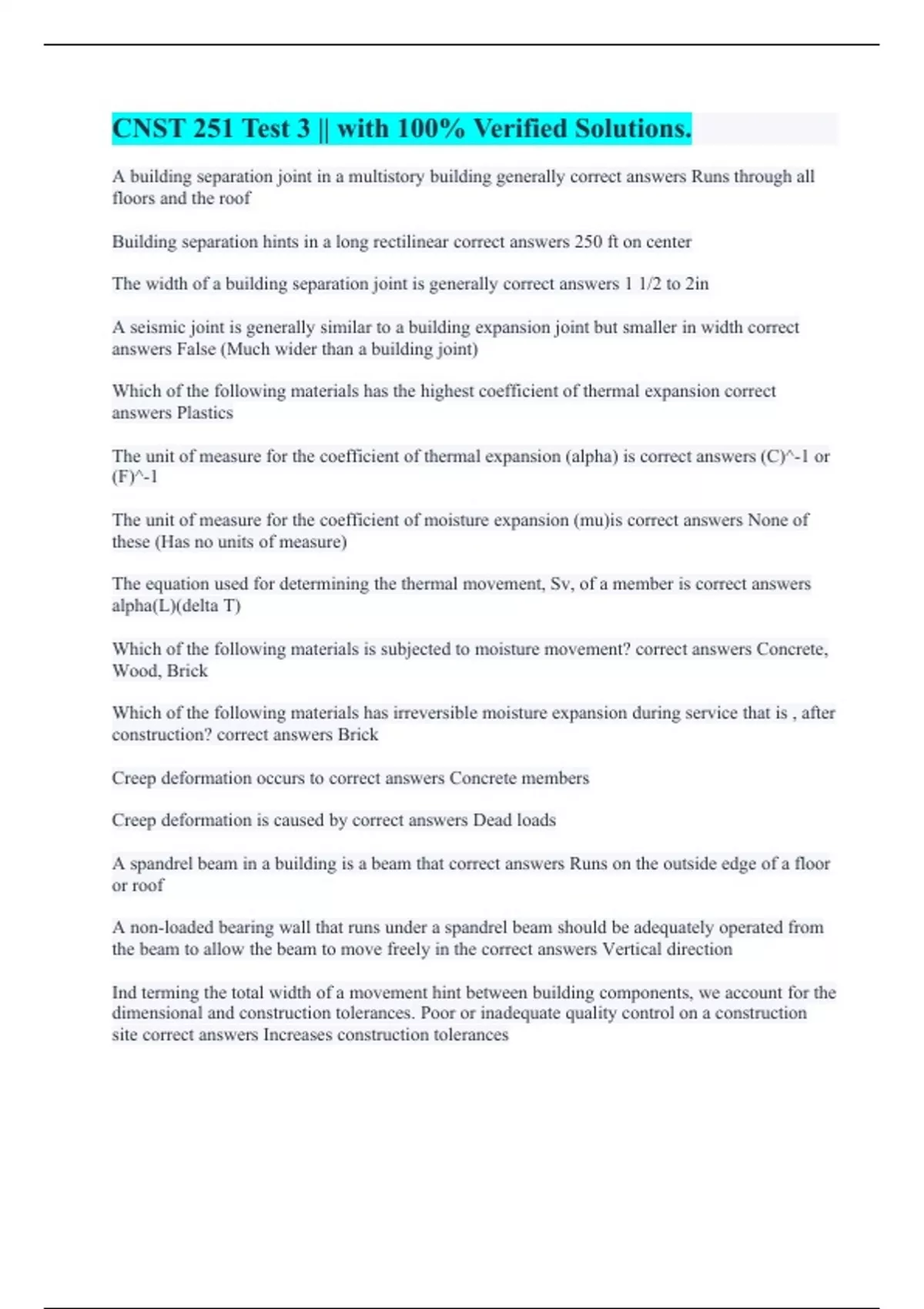 A building separation joint in a multistory building generally correct answers Runs through all floors and the roof Building separation hints in a long rectilinear correct answers 250 ft on center The width of a building separation joint is generally correct answers 1 1/2 to 2in A seismic joint is generally similar to a building expansion joint but smaller in width correct answers False (Much wider than a building joint) Which of the following materials has the highest coefficient of thermal expansion correct answers Plastics The unit of measure for the coefficient of thermal expansion (alpha) is correct answers (C)^-1 or (F)^-1 The unit of measure for the coefficient of moisture expansion (mu)is correct answers None of these (Has no units of measure) The equation used for determining the thermal movement, Sv, of a member is correct answers alpha(L)(delta T) Which of the following materials is subjected to moisture movement? correct answers Concrete, Wood, Brick Which of the following materials has irreversible moisture expansion during service that is , after construction? correct answers Brick Creep deformation occurs to correct answers Concrete members Creep deformation is caused by correct answers Dead loads A spandrel beam in a building is a beam that correct answers Runs on the outside edge of a floor or roof A non-loaded bearing wall that runs under a spandrel beam should be adequately operated from the beam to allow the beam to move freely in the correct answers Vertical direction Ind terming the total width of a movement hint between building components, we account for the dimensional and construction tolerances. Poor or inadequate quality control on a construction site correct answers Increases construction tolerances