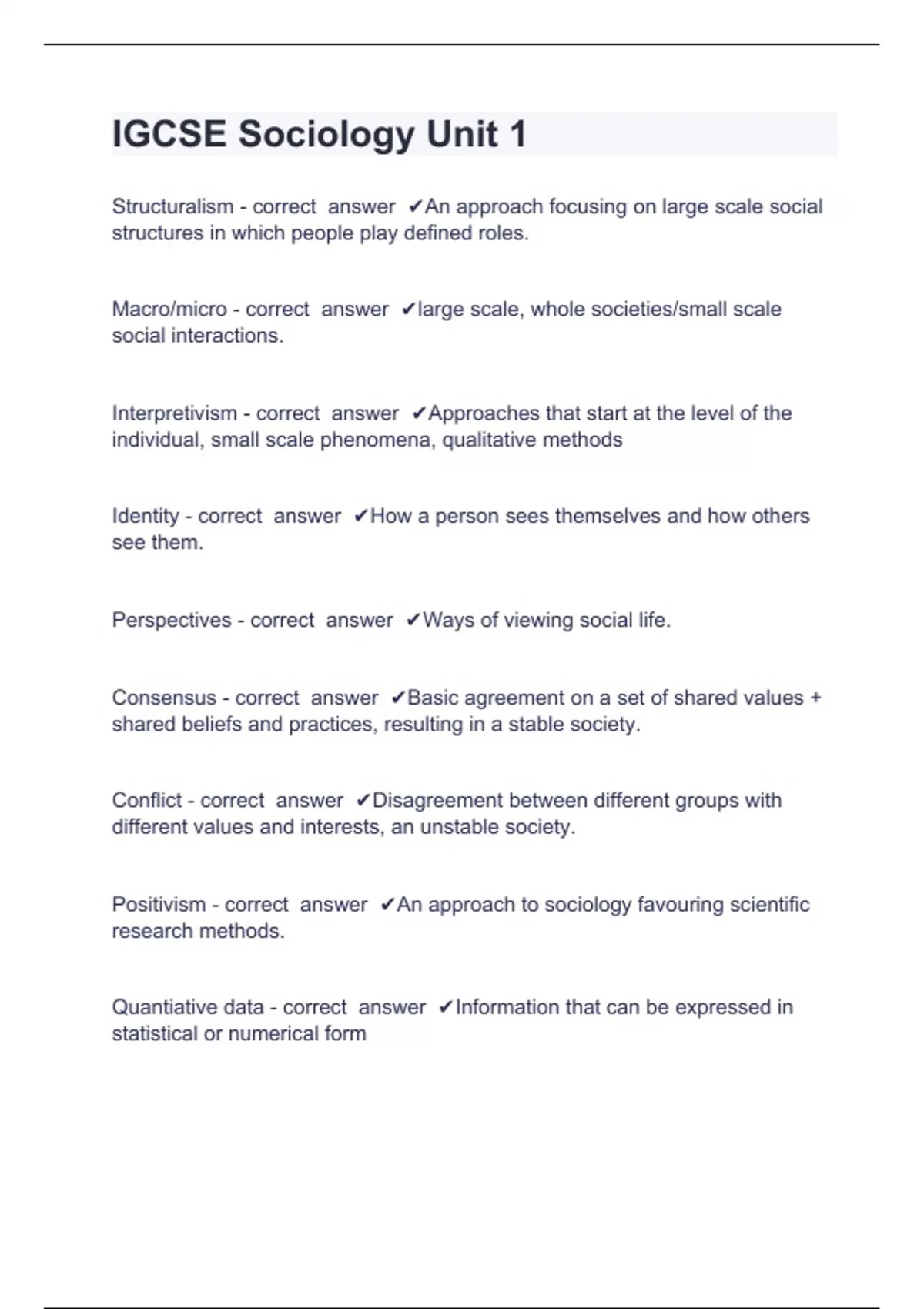 IGCSE Sociology Unit 1 Question and answers correctly solved IGCSE Sociology Unit 1 Structuralism - correct answer An approach focusing on large scale social structures in which people play defined roles. Macro/micro - correct answer large scale, whole societies/small scale social interactions. Interpretivism - correct answer Approaches that start at the level of the individual, small scale phenomena, qualitative methods Identity - correct answer How a person sees themselves and how others see them. Perspectives - correct answer Ways of viewing social life. Consensus - correct answer Basic agreement on a set of shared values + shared beliefs and practices, resulting in a stable society. Conflict - correct answer Disagreement between different groups with different values and interests, an unstable society. Positivism - correct answer An approach to sociology favouring scientific research methods. Quantiative data - correct answer Information that can be expressed in statistical or numerical form