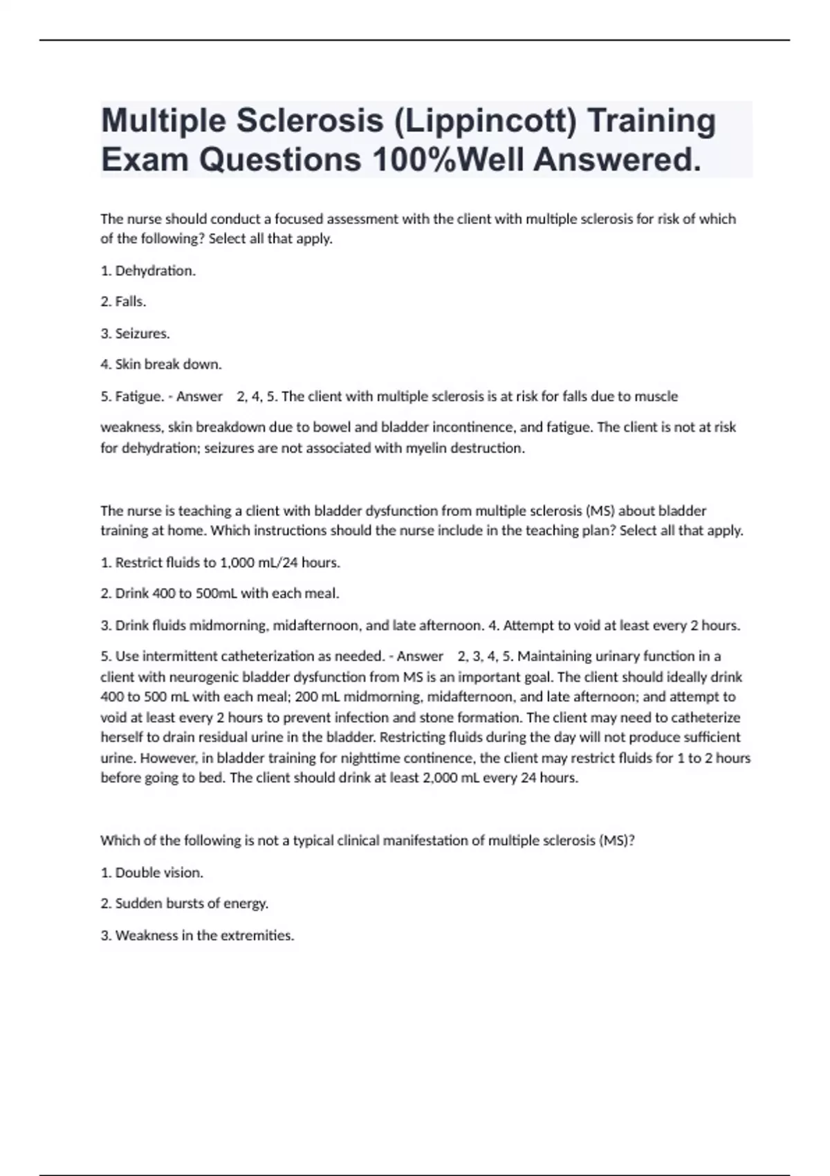 The nurse should conduct a focused assessment with the client with multiple sclerosis for risk of which of the following? Select all that apply. 1. Dehydration. 2. Falls. 3. Seizures. 4. Skin break down. 5. Fatigue. - Answer 2, 4, 5. The client with multiple sclerosis is at risk for falls due to muscle weakness, skin breakdown due to bowel and bladder incontinence, and fatigue. The client is not at risk for dehydration; seizures are not associated with myelin destruction. The nurse is teaching a client with bladder dysfunction from multiple sclerosis (MS) about bladder training at home. Which instructions should the nurse include in the teaching plan? Select all that apply. 1. Restrict fluids to 1,000 mL/24 hours. 2. Drink 400 to 500mL with each meal. 3. Drink fluids midmorning, midafternoon, and late afternoon. 4. Attempt to void at least every 2 hours. 5. Use intermittent catheterization as needed. - Answer 2, 3, 4, 5. Maintaining urinary function in a client with neurogenic bladder dysfunction from MS is an important goal. The client should ideally drink 400 to 500 mL with each meal; 200 mL midmorning, midafternoon, and late afternoon; and attempt to void at least every 2 hours to prevent infection and stone formation. The client may need to catheterize herself to drain residual urine in the bladder. Restricting fluids during the day will not produce sufficient urine. However, in bladder training for nighttime continence, the client may restrict fluids for 1 to 2 hours before going to bed. The client should drink at least 2,000 mL every 24 hours. Which of the following is not a typical clinical manifestation of multiple sclerosis (MS)? 1. Double vision. 2. Sudden bursts of energy. 3. Weakness in the extremities.