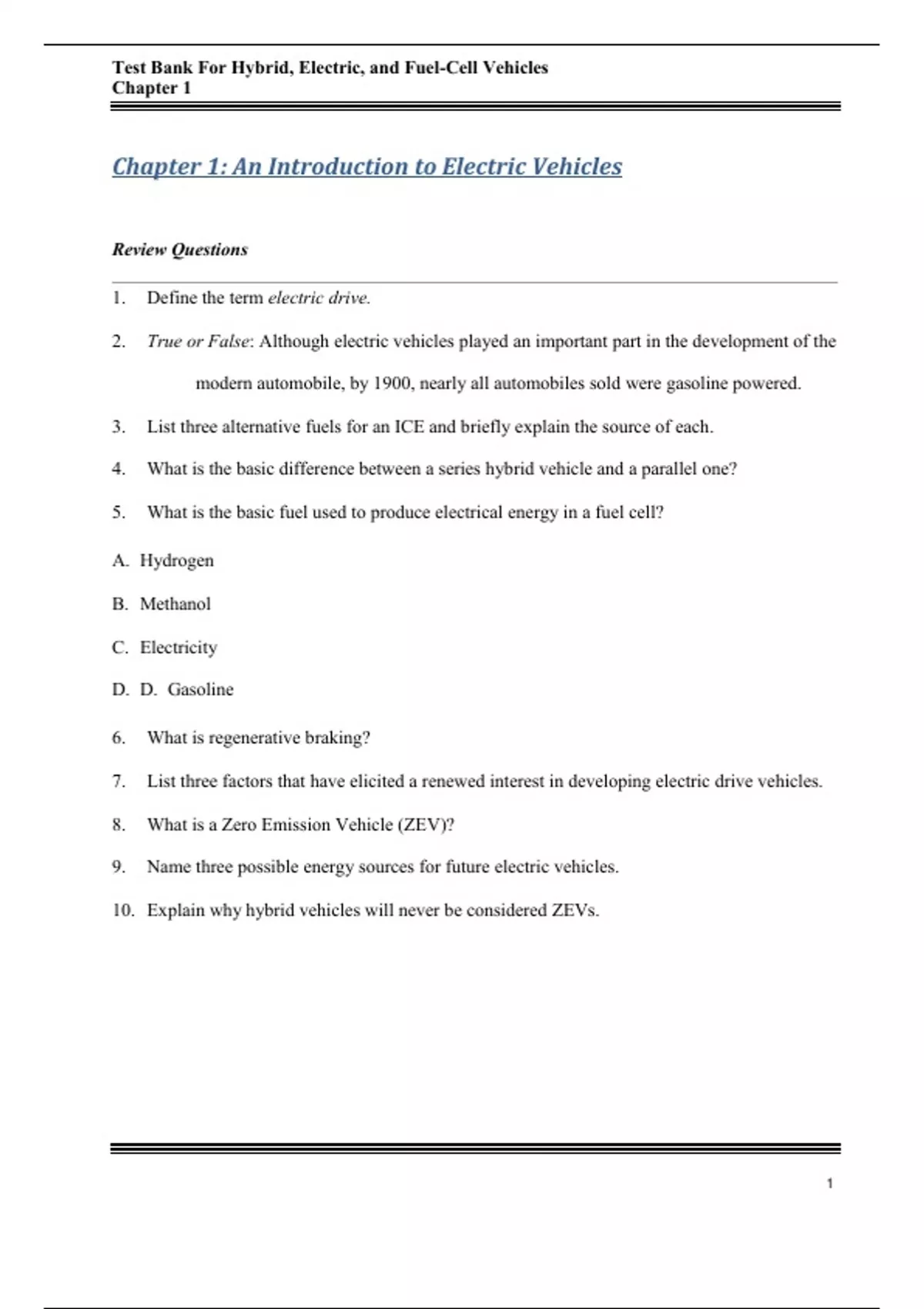 , Test Bank For Hybrid, Electric, and Fuel-Cell Vehicles