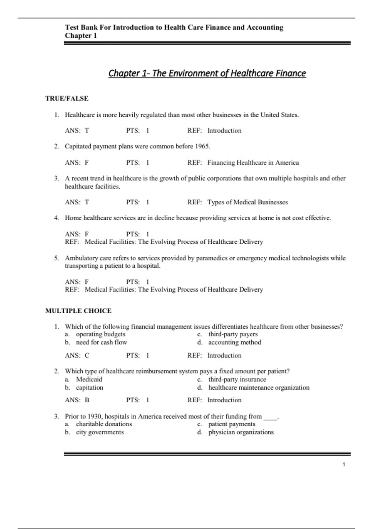, Test Bank For Introduction to Health Care Finance and Accounting