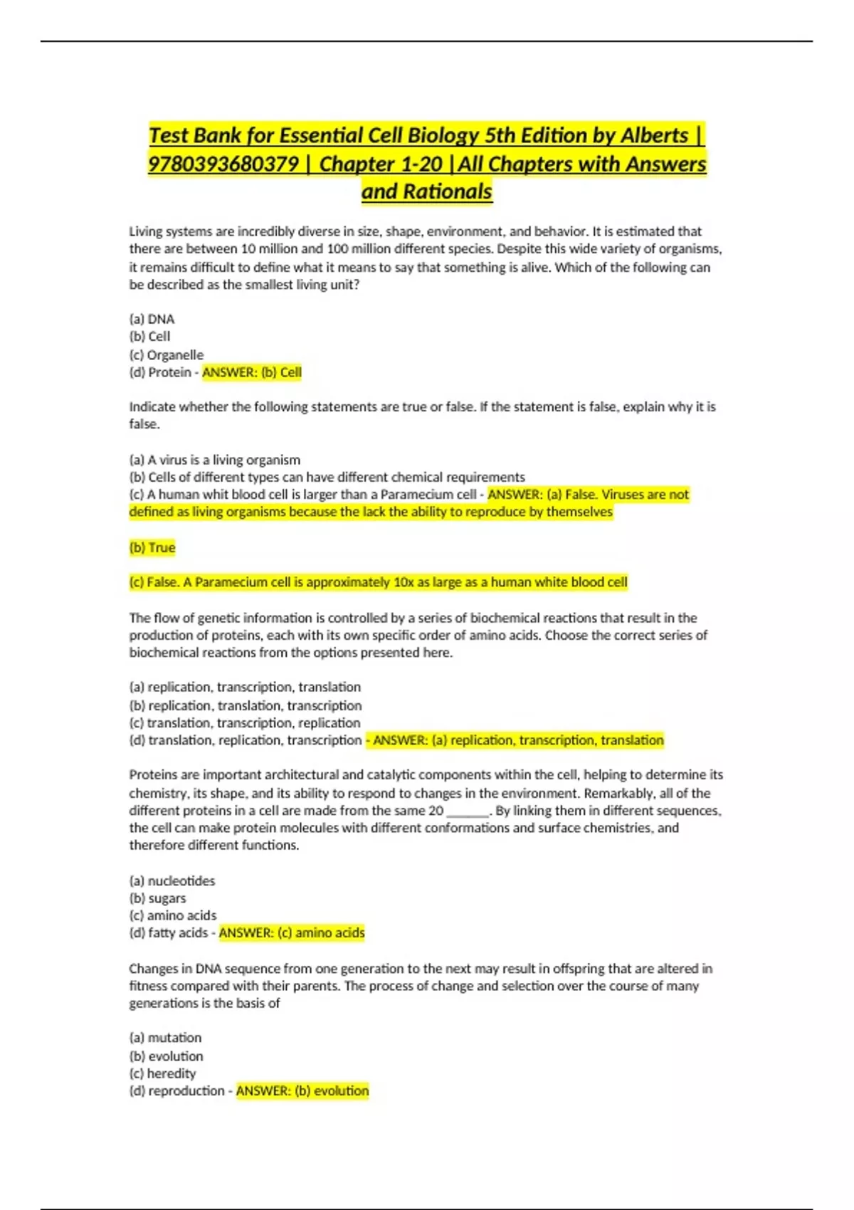 (c) A human whit blood cell is larger than a Paramecium cell - ANSWER: (a) False. Viruses are not
