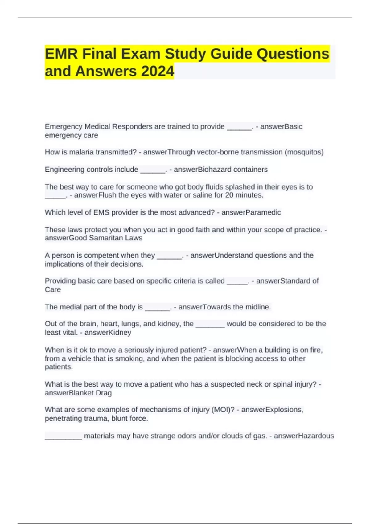 EMR Final Exam Study Guide Questions and Answers 2024 Emergency Medical Responders are trained to provide ______. Basic emergency care How is malaria transmitted? Through vector-borne transmission (mosquitos) Previous Play Next Rewind 10 seconds Move forward 10 seconds Unmute 0:10 / 0:15 Full screen Brainpower Read More Engineering controls include ______. Biohazard containers The best way to care for someone who got body fluids splashed in their eyes is to _____. Flush the eyes with water or saline for 20 minutes. Which level of EMS provider is the most advanced? Paramedic These laws protect you when you act in good faith and within your scope of practice. Good Samaritan Laws A person is competent when they ______. Understand questions and the implications of their decisions. Providing basic care based on specific criteria is called _____. Standard of Care The medial part of the body is ______. Towards the midline. Out of the brain, heart, lungs, and kidney, the _______ would be considered to be the least vital. Kidney When is it ok to move a seriously injured patient? When a building is on fire, from a vehicle that is smoking, and when the patient is blocking access to other patients. What is the best way to move a patient who has a suspected neck or spinal injury? Blanket Drag What are some examples of mechanisms of injury (MOI)? Explosions, penetrating trauma, blunt force. _________ materials may have strange odors and/or clouds of gas. Hazardous When arriving on the scene, this is your number one priority. Scene safety What allows for the maximum hand stability and strength when lifting a patient? Power grip An unstable patient should be reassessed every ____ minutes. 5 What is the most important personal protective equipment that you should be wearing when working with a patient? Disposable gloves What is the main purpose of an ongoing assessment? To identify changes in the patient's condition. A correctly placed blood pressure cuff will be centered over the _____ artery. Brachial What is the first thing you should do when communicating with medical control? Identify yourself True or False. The tongue is the most likely cause of a mechanical airway obstruction. False The ______ plane divided the body horizontally. Axial (transverse) What is the most appropriate way to perform a jaw-thrust maneuver? By sliding your fingers under then angles of the jawbones. You can only insert an oral airway if the patient is ____. Unconscious This organ separated the thoracic cavity from the abdominal cavity, and is responsible for breathing. Diaphragm The _____ is the largest organ of the body. Skin What signs would you expect if hazardous materials were present on a scene? Foul and acrid odors When suctioning a patient, do not suction for more than _____ seconds at a time 15 If a choking patient goes unconscious, then the first thing you must do is ______. Lower them carefully to the ground An oxygen cylinder should be refilled when the pressure gauge reads _____ ppi or below. 200 An advantage of a variable flow rate device on an oxygen tank is that you can ______. Adjust the flow rate for different types of delivery devices. A heart attack is also called a ____. Miocardial Infarction (MI) Never use an oropharyngeal airway if _____. The patient is alert and conscious The best way to suction the mouth is to _____. Apply suction while withdrawing the tip in a sweeping motion. The worst kind of questions to ask a patient begins with _____. Why? The best way to know if a patient is breathing is to _____, _____, and _____. Look, Listen, Feel This is the most important thing to do for a patient having a seizure. Maintain an open airway This is the condition where there is a disruption of blood flow to part of the brain. Stroke One sign that indicate that a patient has overdosed on stimulants is _____. A rapid pulse You should only do a finger sweep in a person's mouth when they are ____. Unconscious If you suspect substance abuse, always _____. Summon more advanced medical personnel What are some examples of chief complaints? My chest hurts. I am having trouble breathing. I can't walk. I feel dizzy. True or False. It is ok to enter a building that smells of strong odors like sulfur or gasoline. False. Call for specialized services for assistance. What is a good treatment for jellyfish stings. Flush the affected site with vinegar.