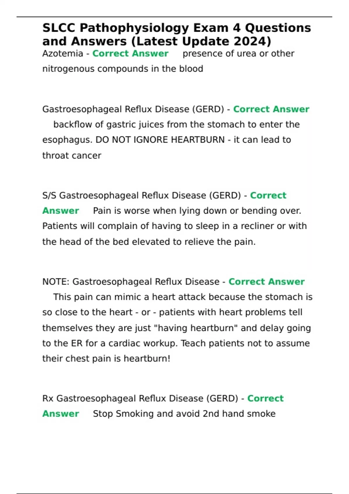 Azotemia - Correct Answer presence of urea or other nitrogenous compounds in the blood Gastroesophageal Reflux Disease (GERD) - Correct Answer backflow of gastric juices from the stomach to enter the esophagus. DO NOT IGNORE HEARTBURN - it can lead to throat cancer S/S Gastroesophageal Reflux Disease (GERD) - Correct Answer Pain is worse when lying down or bending over. Patients will complain of having to sleep in a recliner or with the head of the bed elevated to relieve the pain.