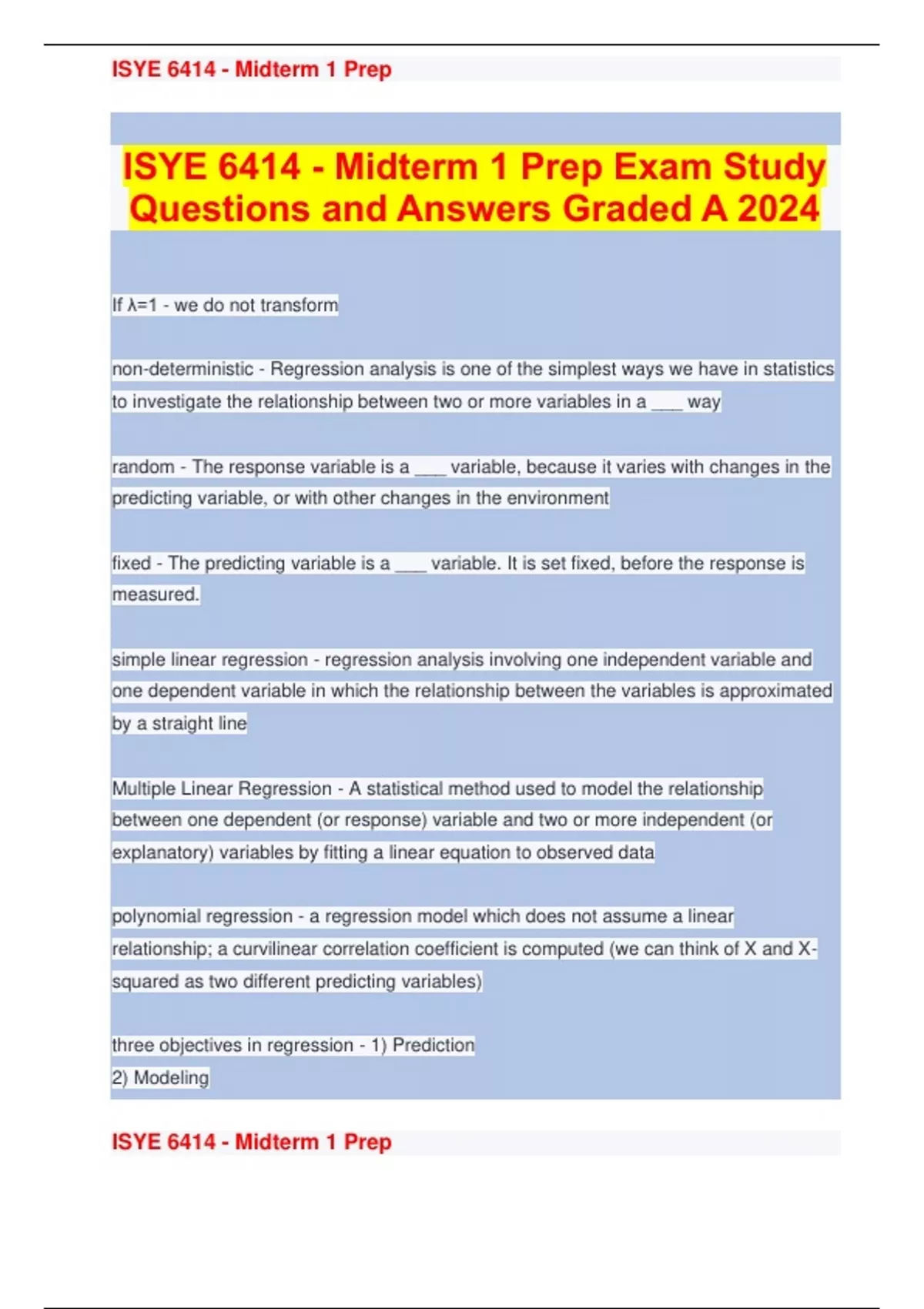ISYE 6414 - Midterm 1 Prep Exam Study Questions and Answers Graded A 2024