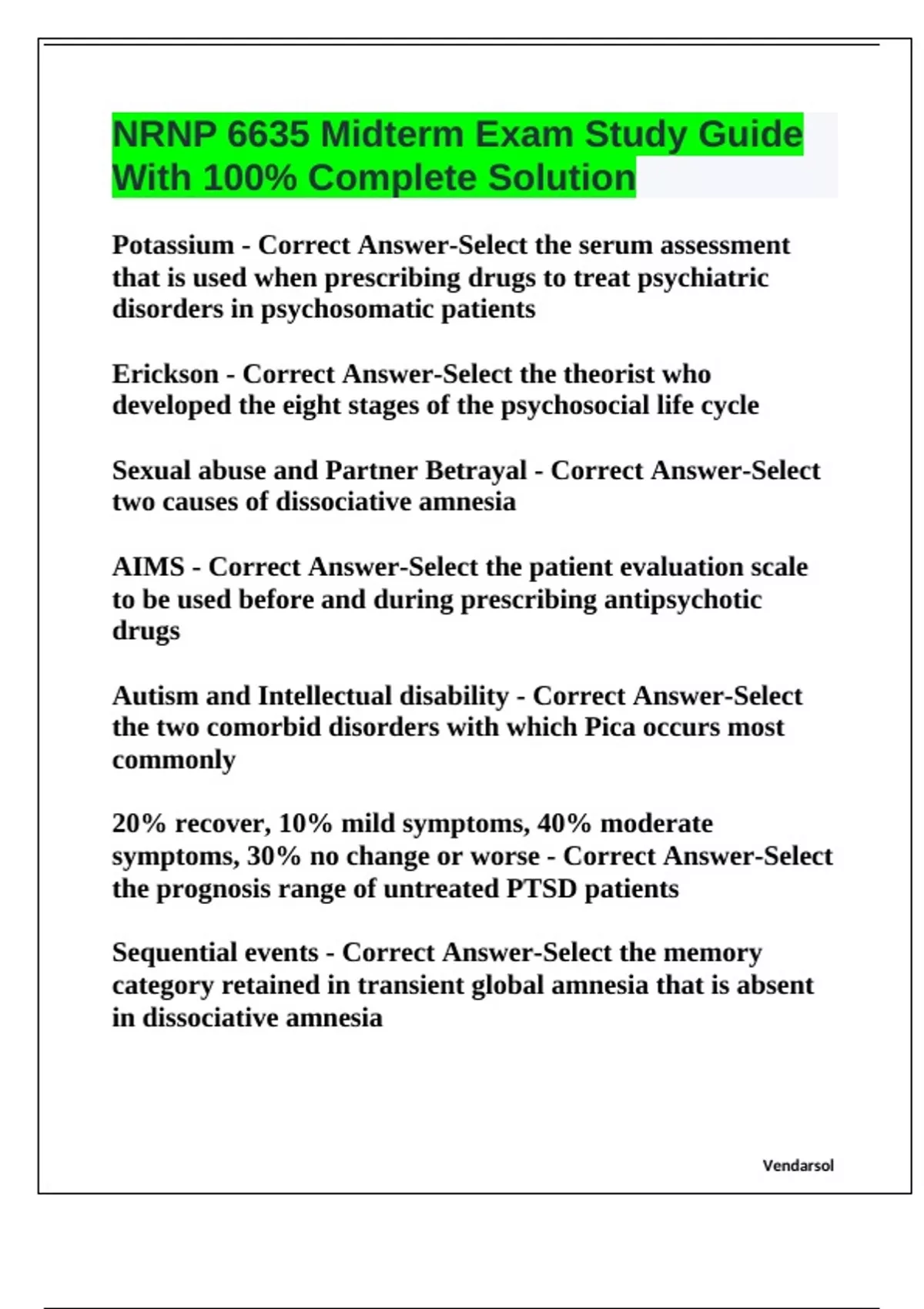 NRNP 6635 Midterm Exam Study Guide With 100% Complete Solution Potassium - Correct Answer-Select the serum assessment that is used when prescribing drugs to treat psychiatric disorders in psychosomatic patients Erickson - Correct Answer-Select the theorist who developed the eight stages of the psychosocial life cycle Sexual abuse and Partner Betrayal - Correct Answer-Select two causes of dissociative amnesia AIMS - Correct Answer-Select the patient evaluation scale to be used before and during prescribing antipsychotic drugs Autism and Intellectual disability - Correct Answer-Select the two comorbid disorders with which Pica occurs most commonly 20% recover, 10% mild symptoms, 40% moderate symptoms, 30% no change or worse - Correct Answer-Select the prognosis range of untreated PTSD patients Sequential events - Correct Answer-Select the memory category retained in transient global amnesia that is absent in dissociative amnesia Eating with friends but not Family - Correct Answer-The following is NOT an endocrine change noted with anorexia nervosa Psychiatrist History and mental status examination - Correct Answer-Select the two most important elements of the psychiatric interview to establish a mental illness diagnosis. Patient Resistance - Correct Answer-Select the greatest impediment to treat anorexia nervosa patients. Central Apnea - Correct Answer-Select the sleep disorder in which cataplexy is a common symptom Hoarding - Correct Answer-Select the obsessive-compulsive disorder for which a patient is likely to initially seek help from a Primary Care Provider CAPS - Correct Answer-Select the rating scale used to assess obsessive-compulsive disorder 4 - Correct Answer-Select age after which encopresis may be correctly diagnosed Dysthymia - Correct Answer-Select the mood disorder that is worsened by chronic exposure to observing violence in television, movies, and video games