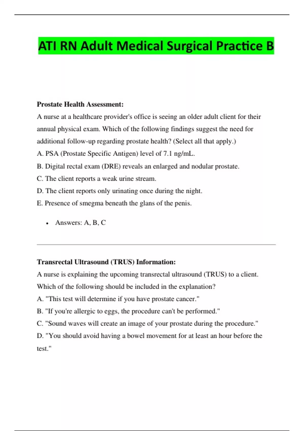 ATI RN Adult Medical Surgical Practice B Prostate Health Assessment: A nurse at a healthcare provider's office is seeing an older adult client for their annual physical exam. Which of the following findings suggest the need for additional follow-up regarding prostate health? (Select all that apply.) A. PSA (Prostate Specific Antigen) level of 7.1 ng/mL. B. Digital rectal exam (DRE) reveals an enlarged and nodular prostate. C. The client reports a weak urine stream. D. The client reports only urinating once during the night. E. Presence of smegma beneath the glans of the penis. • Answers: A, B, C ________________________________________ Transrectal Ultrasound (TRUS) Information: A nurse is explaining the upcoming transrectal ultrasound (TRUS) to a client. Which of the following should be included in the explanation? A. "This test will determine if you have prostate cancer." B. "If you're allergic to eggs, the procedure can't be performed." C. "Sound waves will create an image of your prostate during the procedure." D. "You should avoid having a bowel movement for at least an hour before the test." • Answer: C ________________________________________ Managing Hepatitis B with Ascites: A nurse is planning care for a client with hepatitis B and ascites. Which of the following should be included in the care plan? A. Initiate contact precautions. B. Weigh the client weekly. C. Measure the abdominal girth about 3 inches above the navel. D. Provide a high-calorie and high-carbohydrate diet. • Answer: D ________________________________________ Hepatitis C Diagnosis: A nurse is assessing a client newly diagnosed with hepatitis C. Which of the following lab findings should the nurse expect? A. Presence of immunoglobulin G (IgG) antibodies. B. Positive enzyme immunoassay (EIA) test. C. Aspartate aminotransferase (AST) level of 35 units/L. D. Alanine aminotransferase (ALT) level of 15 IU/L. • Answer: B ________________________________________ Hepatic Encephalopathy Indicators: A nurse is assessing a client with advanced cirrhosis. Which of the following are signs of hepatic encephalopathy? (Select all that apply.) A. Anorexia B. Change in orientation C. Asterixis (flapping tremor) D. Ascites E. Fetor hepaticus (musty breath odor) • Answers: B, C, E