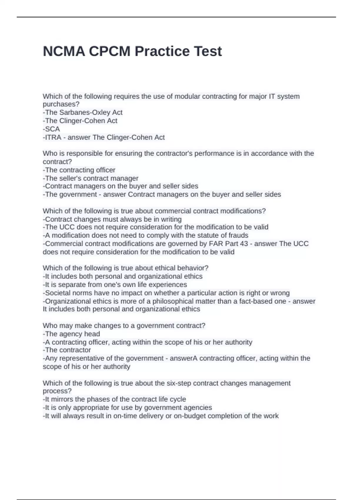 NCMA CPCM Practice Test Questions and Answers 100% Correct