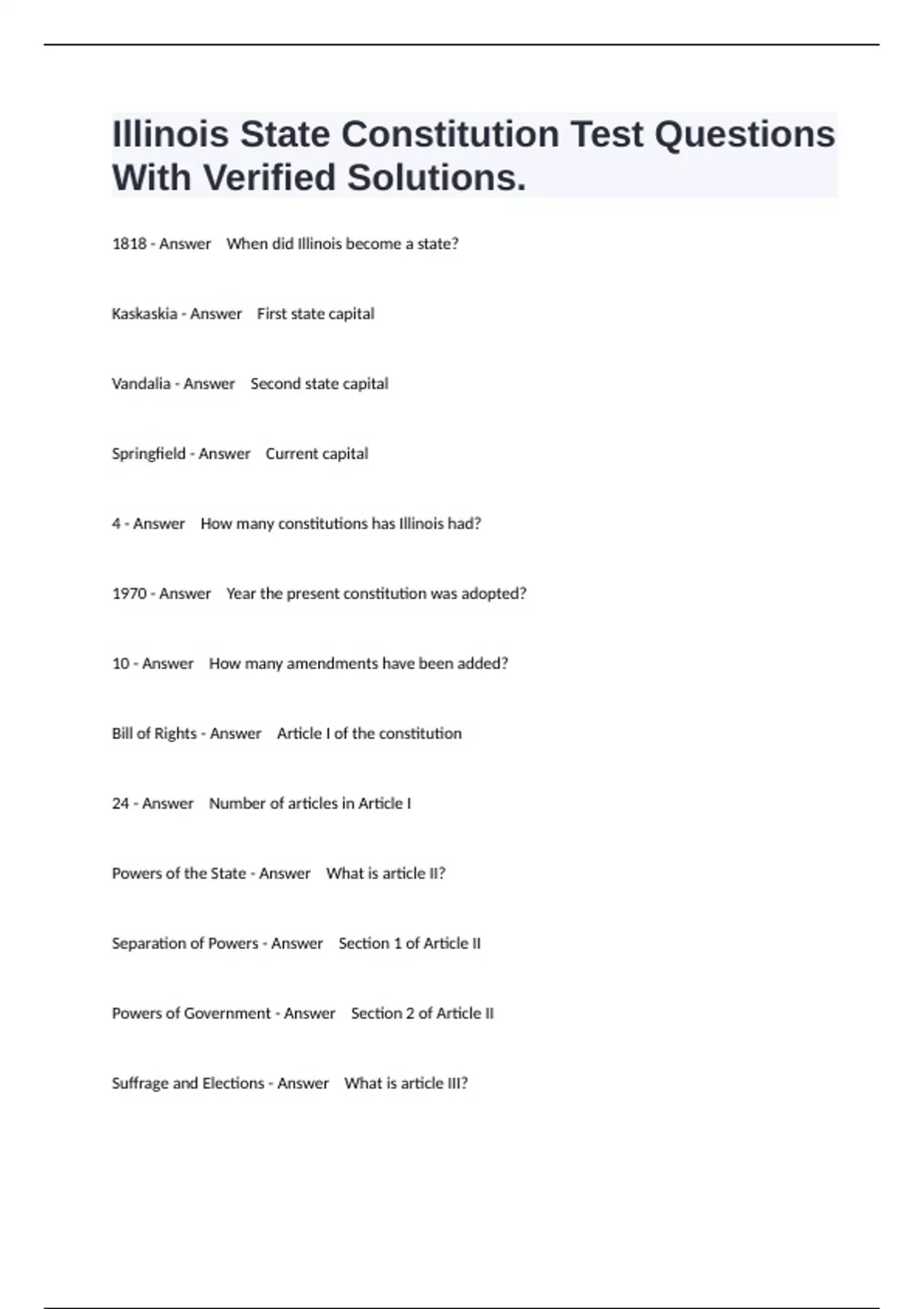 1818 - Answer When did Illinois become a state? Kaskaskia - Answer First state capital Vandalia - Answer Second state capital Springfield - Answer Current capital 4 - Answer How many constitutions has Illinois had? 1970 - Answer Year the present constitution was adopted? 10 - Answer How many amendments have been added? Bill of Rights - Answer Article I of the constitution 24 - Answer Number of articles in Article I Powers of the State - Answer What is article II? Separation of Powers - Answer Section 1 of Article II Powers of Government - Answer Section 2 of Article II Suffrage and Elections - Answer What is article III?