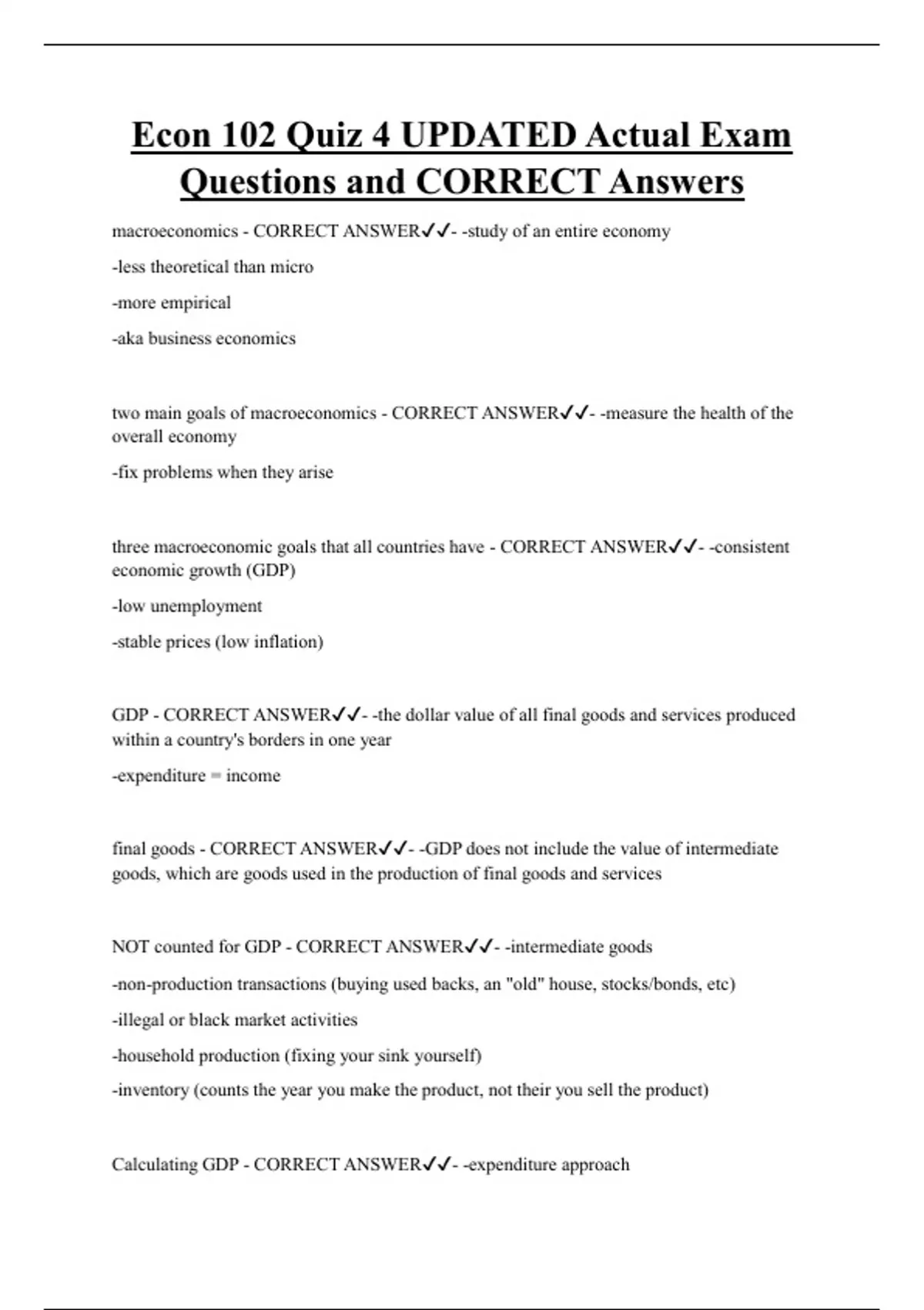 Econ 102 Quiz 4 UPDATED Actual Exam Questions and CORRECT Answers macroeconomics - CORRECT ANSWER- -study of an entire economy -less theoretical than micro -more empirical -aka business economics two main goals of macroeconomics - CORRECT ANSWER- -measure the health of the overall economy -fix problems when they arise