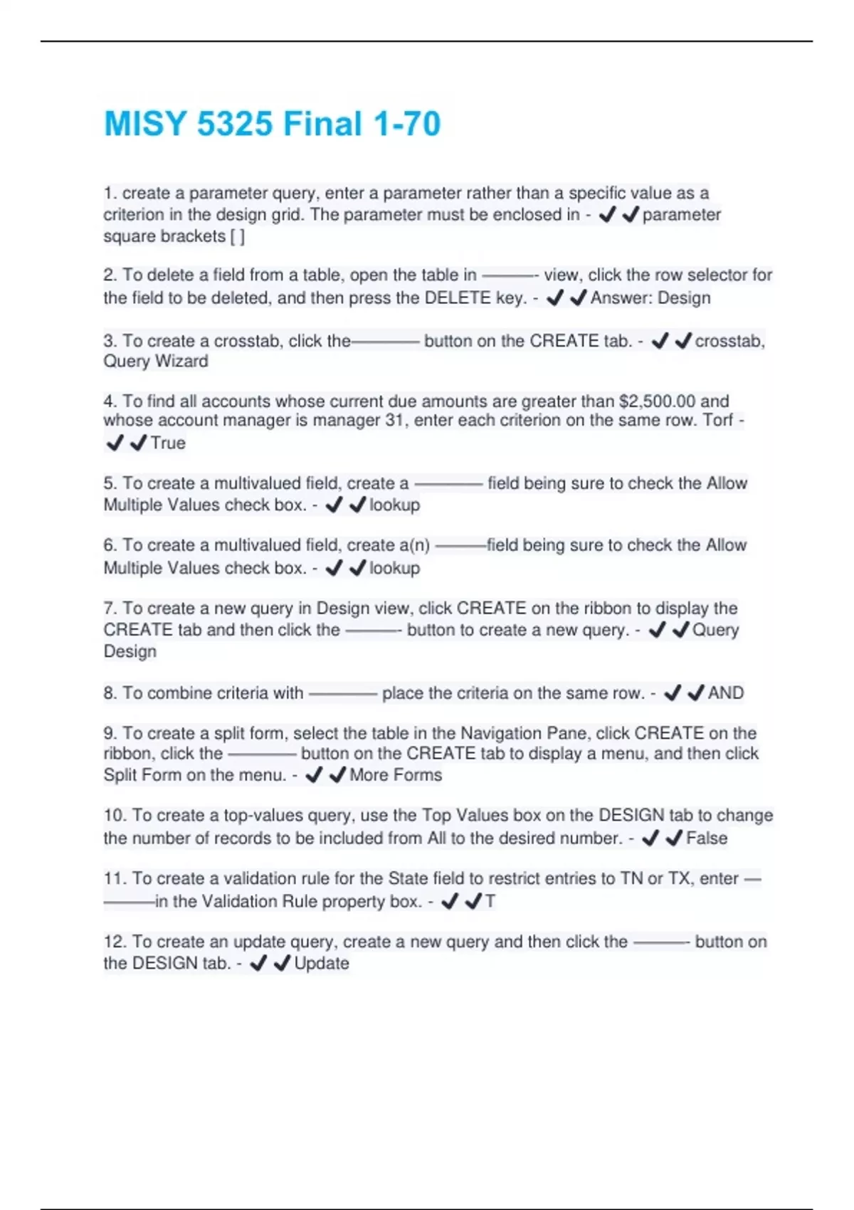 1. create a parameter query, enter a parameter rather than a specific value as a criterion in the design grid. The parameter must be enclosed in - ️️parameter square brackets [ ] 2. To delete a field from a table, open the table in ———- view, click the row selector for the field to be deleted, and then press the DELETE key. - ️️Answer: Design 3. To create a crosstab, click the———— button on the CREATE tab. - ️️crosstab, Query Wizard 4. To find all accounts whose current due amounts are greater than $2,500.00 and whose account manager is manager 31, enter each criterion on the same row. Torf - ️️True 5. To create a multivalued field, create a ———— field being sure to check the Allow Multiple Values check box. - ️️lookup 6. To create a multivalued field, create a(n) ———field being sure to check the Allow Multiple Values check box. - ️️lookup 7. To create a new query in Design view, click CREATE on the ribbon to display the CREATE tab and then click the ———- button to create a new query. - ️️Query Design 8. To combine criteria with ———— place the criteria on the same row. - ️️AND 9. To create a split form, select the table in the Navigation Pane, click CREATE on the ribbon, click the ———— button on the CREATE tab to display a menu, and then click Split Form on the menu. - ️️More Forms 10. To create a top-values query, use the Top Values box on the DESIGN tab to change the number of records to be included from All to the desired number. - ️️False 11. To create a validation rule for the State field to restrict entries to TN or TX, enter — ———in the Validation Rule property box. - ️️T 12. To create an update query, create a new query and then click the ———- button on the DESIGN tab. - ️️Update13. To define an additional field in Datasheet view, tap or click the ———- column heading. - ️️Click to Add 14. To define an additional field in Datasheet view, tap or click the ———— column heading, select the data type, and then type the field name. - ️️Click to Add 15. To delete a database object, press and hold or right-click the object in the Navigation Pane and then tap or click ———- on the shortcut menu. - ️️Delete 16. To compact and repair a database, tap or click ———— button in the Info gallery in the Backstage view. - ️️Compact & Repair 17. To delete a field in a table, press and hold or right-click the column heading for the field, and then tap or click ————-on the shortcut menu. - ️️Delete Field 18. To delete a field, press and hold or right-click the column heading for the field, and then tap or click Remove Field on the shortcut menu. T/F - ️️False