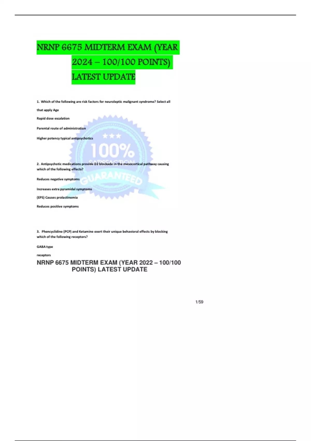 1. Which of the following are risk factors for neuroleptic malignant syndrome? Select all that apply Age Rapid dose escalation Parental route of administration Higher potency typical antipsychotics 2. Antipsychotic medications provide D2 blockade in the mesocortical pathway causing which of the following effects? Reduces negative symptoms Increases extra pyramidal symptoms (EPS) Causes prolactinemia Reduces positive symptoms 3. Phencyclidine (PCP) and Ketamine exert their unique behavioral effects by blocking which of the following receptors? GABA type receptors NRNP 6675 MIDTERM EXAM (YEAR 2022 – 100/100 POINTS) LATEST UPDATE 2/59 Serotonin receptors 3