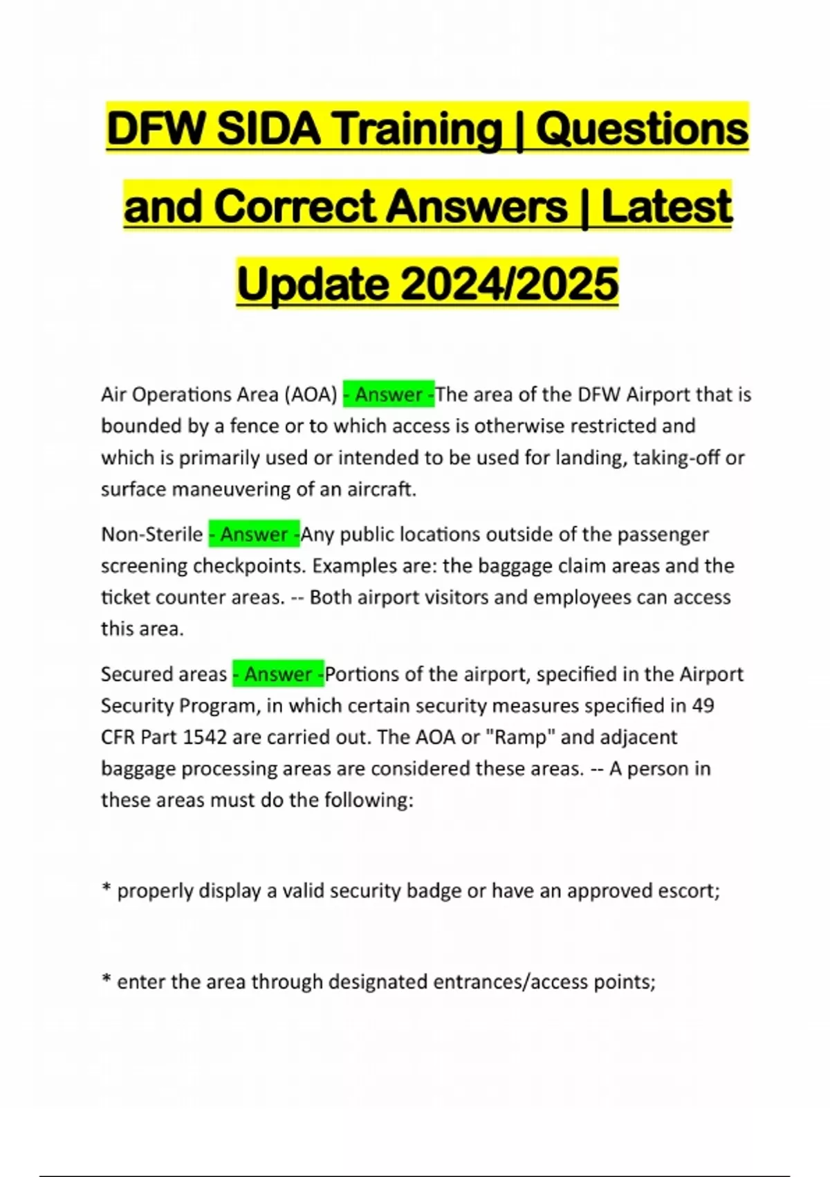 DFW SIDA Training | Questions and Correct Answers | Latest Update 2024/2025 Air Operations Area (AOA) - Answer -The area of the DFW Airport that is bounded by a fence or to which access is otherwise restricted and which is primarily used or intended to be used for landing, taking-off or surface maneuvering of an aircraft. Non-Sterile - Answer -Any public locations outside of the passenger screening checkpoints. Examples are: the baggage claim areas and the ticket counter areas. -- Both airport visitors and employees can access this area. Secured areas - Answer -Portions of the airport, specified in the Airport Security Program, in which certain security measures specified in 49 CFR Part 1542 are carried out. The AOA or "Ramp" and adjacent baggage processing areas are considered these areas. -- A person in these areas must do the following: * properly display a valid security badge or have an approved escort; * enter the area through design