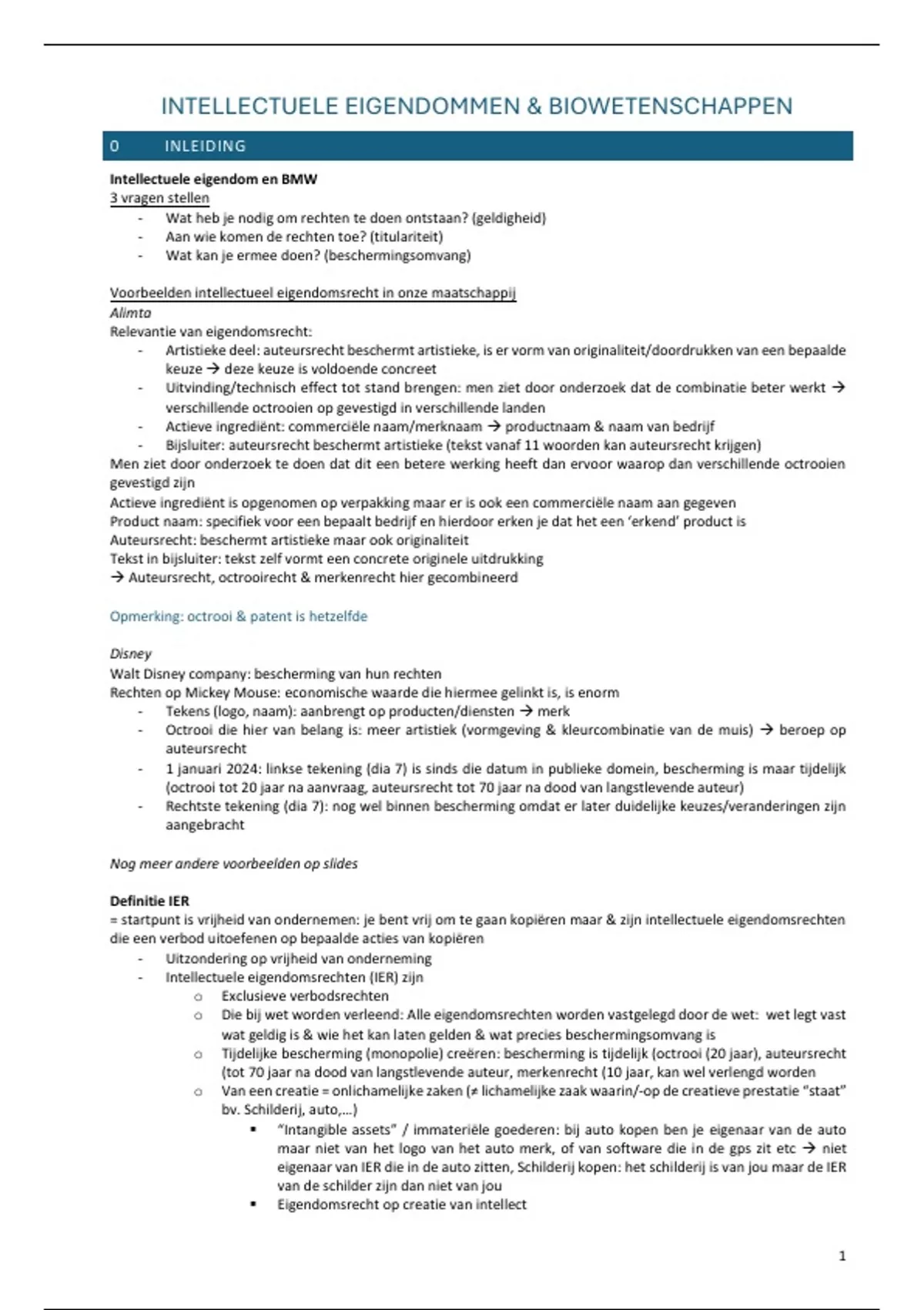 Uitgebreide samenvatting van het vak Intellectuele eigendommen gegeven in 1ste master Biomedische Wetenschappen. In combinatie met de beknopte samenvatting behaalde ik een 16/20 in eerste zit. Combinatie van slides, notities, figuren/tekeningen zoals gezien in de les.