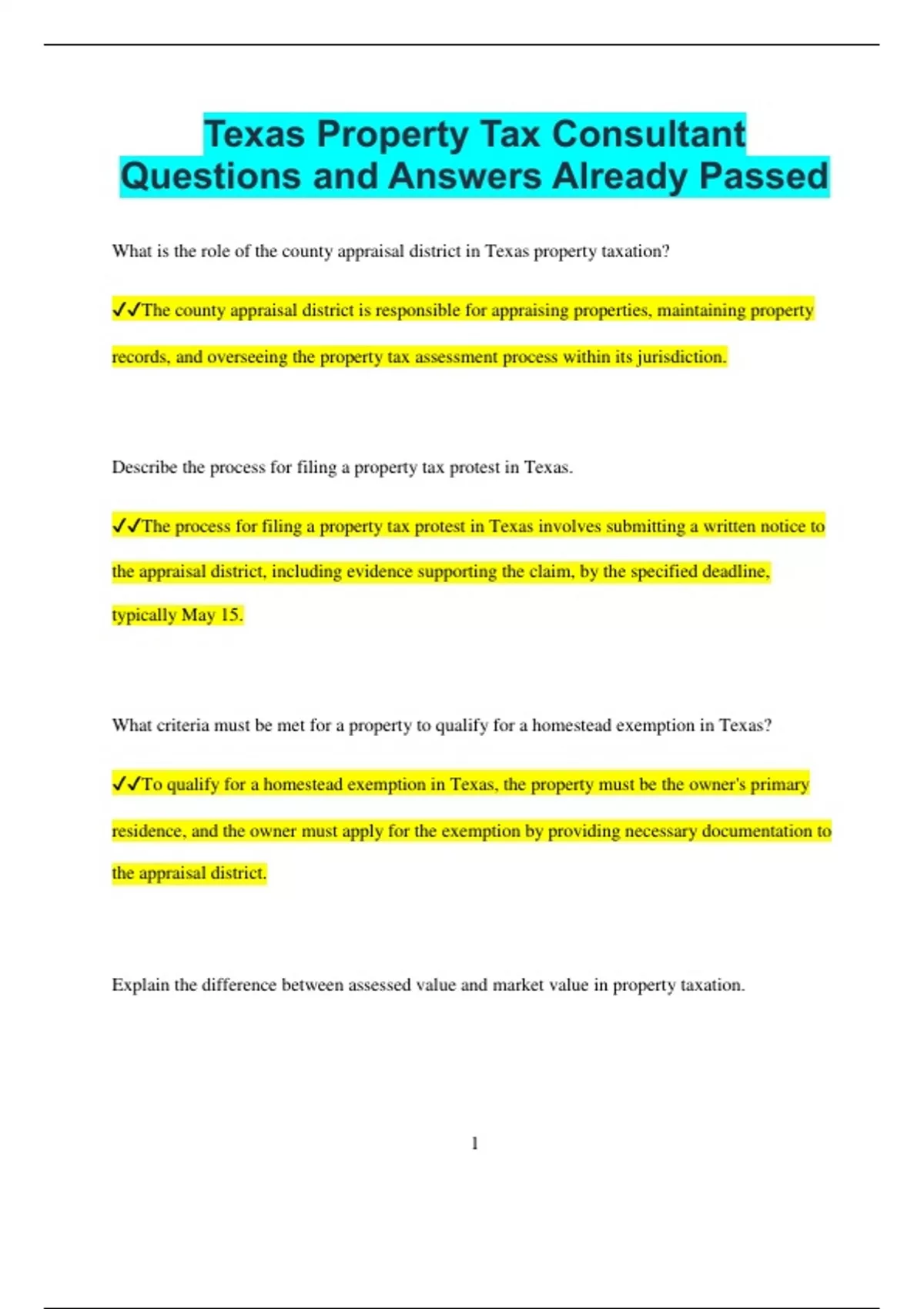 Texas Property Tax Consultant Questions and Answers Already Passed What is the role of the county appraisal district in Texas property taxation? The county appraisal district is responsible for appraising properties, maintaining property records, and overseeing the property tax assessment process within its jurisdiction. Describe the process for filing a property tax protest in Texas. The process for filing a property tax protest in Texas involves submitting a written notice to the appraisal district, including evidence supporting the claim, by the specified deadline, typically May 15. What criteria must be met for a property to qualify for a homestead exemption in Texas? To qualify for a homestead exemption in Texas, the property must be the owner's primary residence, and the owner must apply for the exemption by providing necessary documentation to the appraisal district. Explain the difference between assessed value and market value in property taxation. 2 Assessed value is the value determined by the appraisal district for tax purposes, often set at a percentage of market value, which is the price the property would likely sell for in a competitive market. What types of properties are generally exempt from property taxes in Texas? Properties generally exempt from property taxes in Texas include properties owned by charitable organizations, religious institutions, and government entities, as well as certain agricultural properties. How often must property values be reviewed and adjusted in Texas? Property values must be reviewed and adjusted at least once every year to ensure that they reflect current market conditions and comply with state law. What is the significance of the equal and uniform clause in Texas property tax law? The equal and uniform clause requires that all properties within a taxing jurisdiction be assessed at the same rate, ensuring fairness and equity in property taxation. What documentation is required to support a property tax protest? 3 Documentation required to support a property tax protest may include recent sales data of comparable properties, photographs, and an independent appraisal report. What are the common exemptions available