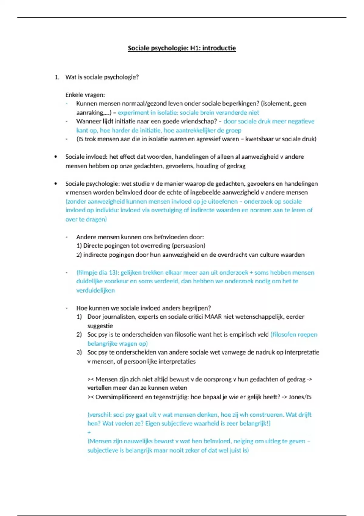 Sociale Psychologie I VUB, samenvattingen H1 - H8 (Prof. Van Overwalle)