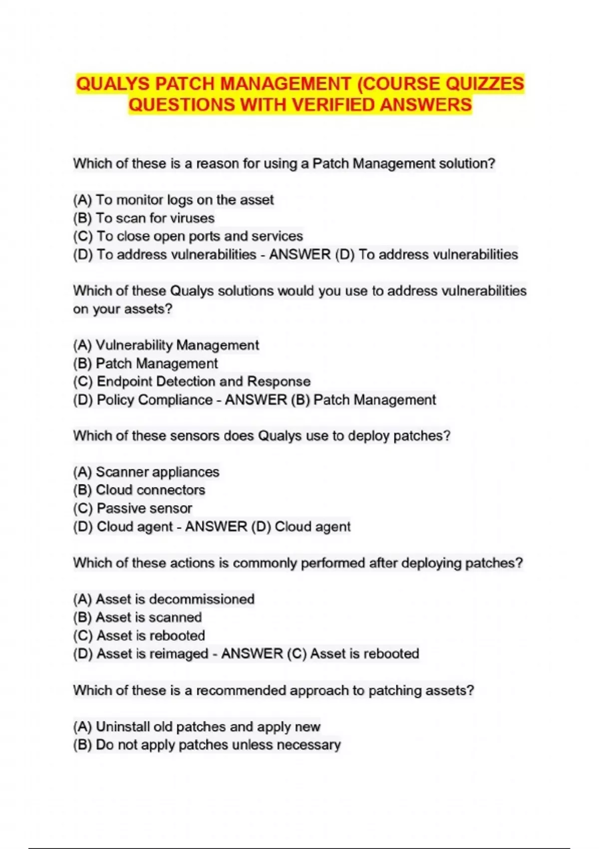 QUALYS PATCH MANAGEMENT (COURSE QUIZZES QUESTIONS WITH VERIFIED ANSWERS...