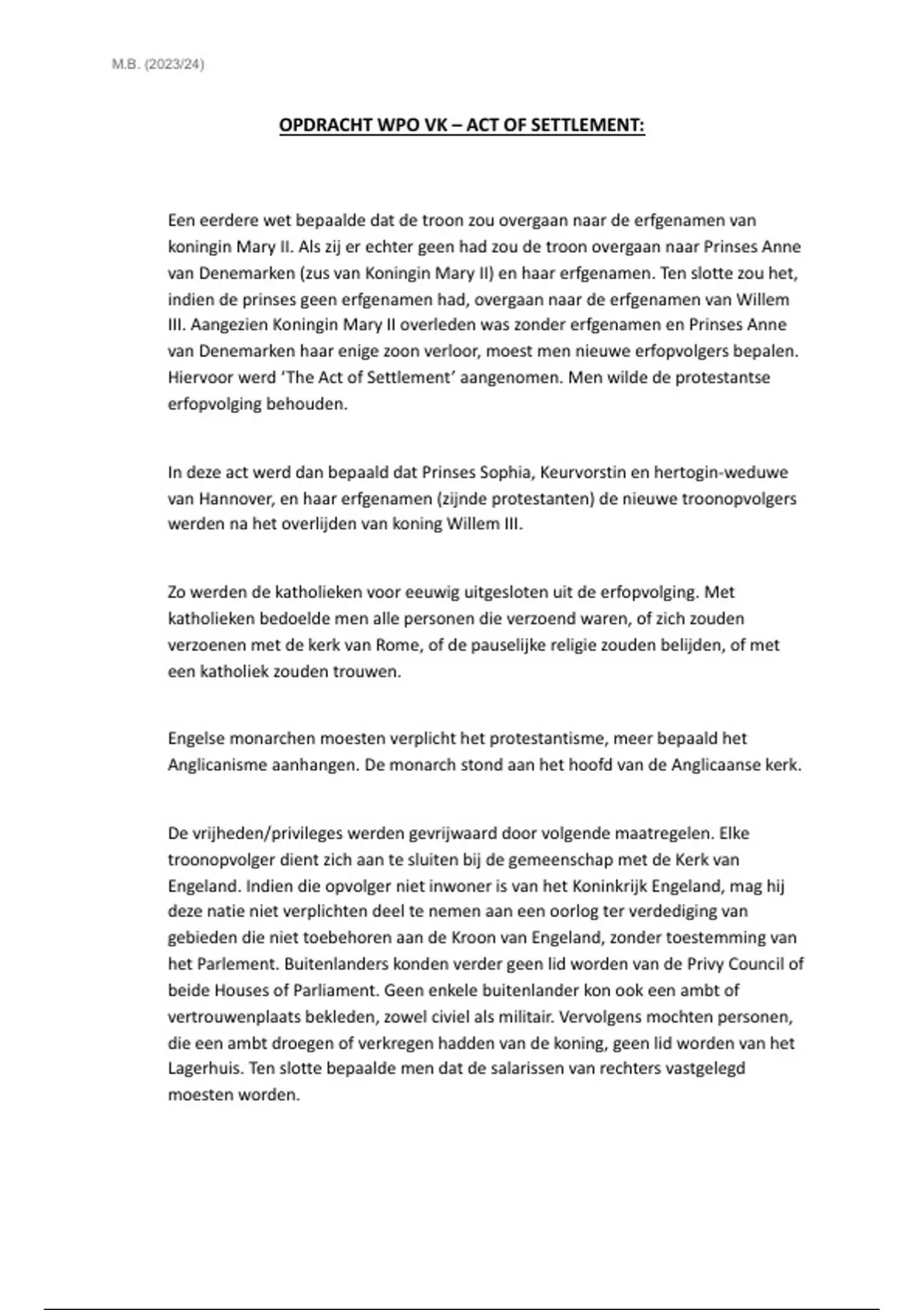 OPDRACHT WPO VK – ACT OF SETTLEMENT: