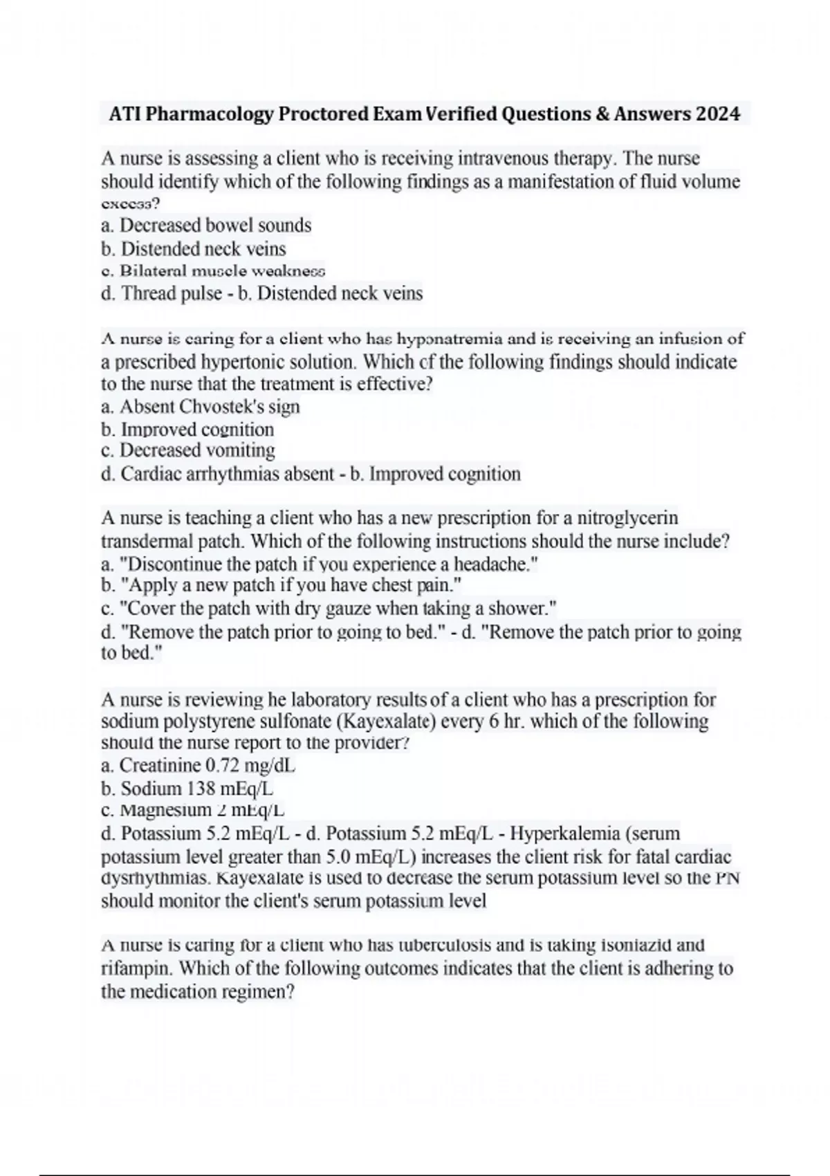 A nurse is assessing a client who is receiving intravenous therapy. The nurse should identify which of the following findings as a manifestation of fluid volume excess? a. Decreased bowel sounds b. Distended neck veins c. Bilateral muscle weakness d. Thread pulse - b. Distended neck veins A nurse is caring for a client who has hyponatremia and is receiving an infusion of a prescribed hypertonic solution. Which of the following findings should indicate to the nurse that the treatment is effective? a. Absent Chvostek's sign b. Improved cognition c. Decreased vomiting d. Cardiac arrhythmias absent - b. Improved cognition A nurse is teaching a client who has a new prescription for a nitroglycerin transdermal patch. Which of the following instructions should the nurse include? a. "Discontinue the patch if you experience a headache." b. "Apply a new patch if you have chest pain." c. "Cover the patch with dry gauze when taking a shower." d. "Remove the patch prior to going to bed." - d. "Remove the patch prior to going to bed." A nurse is reviewing he laboratory results of a client who has a prescription for sodium polystyrene sulfonate (Kayexalate) every 6 hr. which of the following should the nurse report to the provider? a. Creatinine 0.72 mg/dL b. Sodium 138 mEq/L c. Magnesium 2 mEq/L d. Potassium 5.2 mEq/L - d. Potassium 5.2 mEq/L - Hyperkalemia (serum potassium level greater than 5.0 mEq/L) increases the client risk for fatal cardiac dysrhythmias. Kayexalate is used to decrease the serum potassium level so the PN should monitor the client's serum potassium level A nurse is caring for a client who has tuberculosis and is taking isoniazid and rifampin. Which of the following outcomes indicates that the client is adhering to the medication regimen? a. The client has a negative sputum culture b. The client tests negative for HIV c. The client has a positive purified protein derivative test d. The client's liver function test results are within the expected reference range - a. The client has a negative sputum culture A client is caring for a client who develops an anaphylactic reaction to IV administration. After assessing the client's respiratory status and stopping the medication infusion. Which of the following actions should the nurse take next? a. Replace the infusion with 0.9% sodium chloride b. Give diphenhydramine IM c. Elevate the client's legs and feet d. Administer epinephrine IM - d. Administer epinephrine IM A nurse is caring for a client who is taking sertraline and reports a desire to begin taking supplements. Which of the following supplements should the nurse advise the client to avoid? a. St. John's Wort b. Ginger root c. Black cohosh d. Coenzyme Q10 - a. St. John's Wort A nurse is caring for a client who has heart failure and a new prescription for lisinopril. For which of the following adverse effects should the nurse monitor when administering lisinopril? a. Bradycardia b. Hypokalemia c. Tinnitus d. Hypotension - d. Hypotension A nurse is assessing a client who is receiving heparin IV continuous IV. The client has an PPT of 90 seconds. They should monitor the client for which of the following changes in their vital signs? a. Decreased temperature b. Increased pulse rate c. Decreased respiratory rate d. Increased blood pressure - d. Increased blood pressure A nurse is preparing to administer medication to a client and discovers a medication error. The nurse should recognize that which of the following staff members is responsible for completing an incident report? a. The quality improvement committee b. The nurse who identifies the error c. The nurse who caused the error d. The charge nurse - b. The nurse who identifies the error A nurse is planning care for a client who is receiving morphine via continuous epidural infusion. The nurse should monitor the client for which of the following? a. Pruritus b. Cough c. Tachypnea d. Gastric bleeding - a. Pruritus - Sign of allergic reaction to morphine A nurse is preparing to administer digoxin orally to a client. Identify the sequence of steps the nurse should take. (Move the steps into the box on the right placing them in the order of performance. Use all the steps.) - a. Obtain the client's apical heart rate b. Remove the medication from the dispensing system c. Open the medication package d. Compare the client's wristband to the medication administration record e. Document administration of the medication A nurse is reviewing the medical record of an adult client who has a fever and a prescription for acetaminophen. Which of the following findings should the nurse identify as a contraindication for receiving this medication? a. Alcohol use disorder b. Chronic kidney disease c. Hepatitis B vaccine within the last week d. Diabetes mellitus - a. Alcohol use disorder b. Chronic kidney disease A home health nurse is visiting a client who has heart failure and a prescription for furosemide. The nurse identifies that the client has gained 2.5 kg (5 lb.) since the last visit 2 days ago. Which of the following actions should the nurse take first? a. Encourage the client to dangle the legs while sitting in a chair b. Teach the client about foods low in sodium c. Determine medication adherence by the client d. Notify the provider of the client's weight gain - c. Determine medication adherence by the client A nurse is preparing to administer the initial dose of penicillin G IM to a client. The nurse should monitor for which of the following as an indication of an allergic reaction following the injection? a. Urticaria b. Bradycardia c. Pallor d. Dyspepsia - a. Urticaria A nurse is teaching a client who has angina a new prescription for sublingual nitroglycerin tablets. Which of the following instructions should the nurse include in the teaching? a. "Discard any tablets you do not use every 6 months." b. "Take one tablet each morning 30 minutes prior to eating." c. "Keep the tablets at room temperature in their original glass bottle." d. "