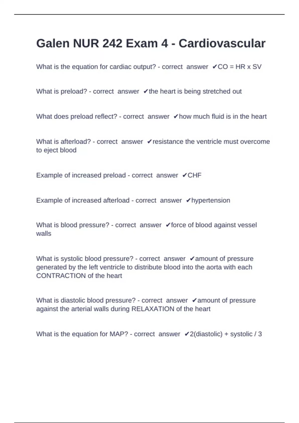 Galen NUR 242 Exam 4 Galen College Of Nursing - Questions with complete solution Galen NUR 242 Exam 4 - Cardiovascular What is the equation for cardiac output? - correct answer CO = HR x SV What is preload? - correct answer the heart is being stretched out What does preload reflect? - correct answer how much fluid is in the heart What is afterload? - correct answer resistance the ventricle must overcome to eject blood Example of increased preload - correct answer CHF Example of in