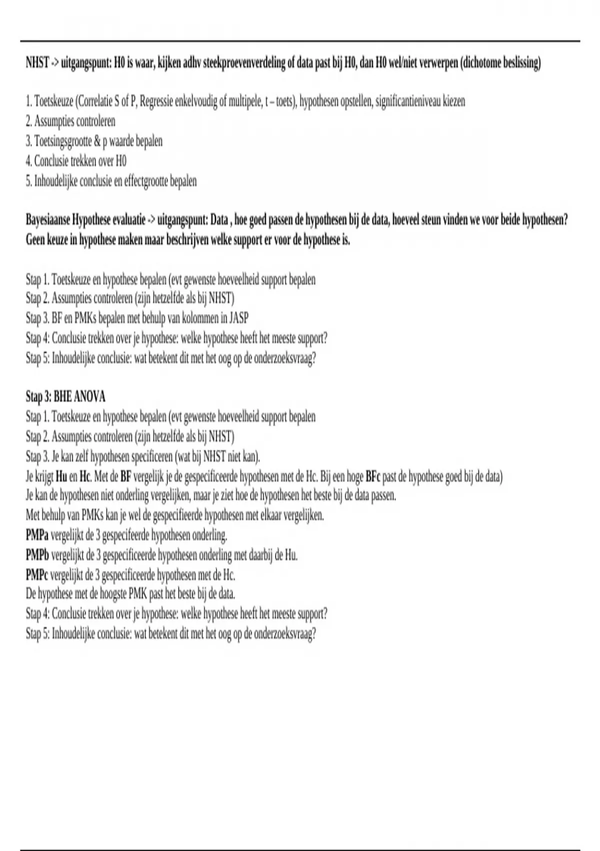 Tabel met de stappen van NHST en BHE, ook alle Analystechnieken uitgewerkt, met hypothesen, assumpties, toetsingsgrootheid en effectgrootte.