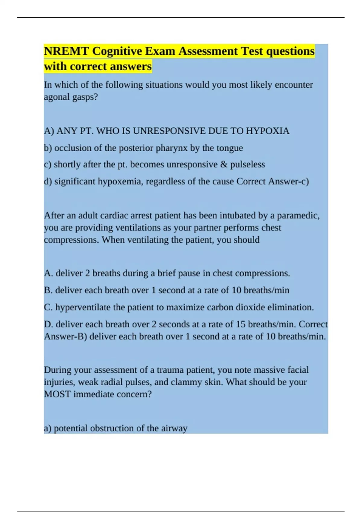 NREMT Cognitive Exam Assessment Test questions with correct answers.