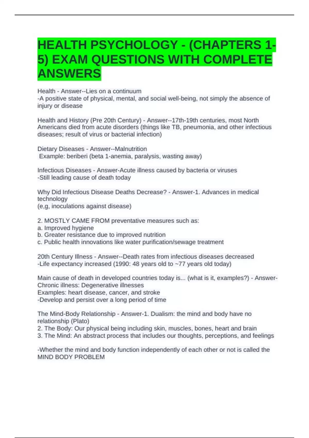 HEALTH PSYCHOLOGY - (CHAPTERS 1-5) EXAM QUESTIONS WITH COMPLETE ANSWERS