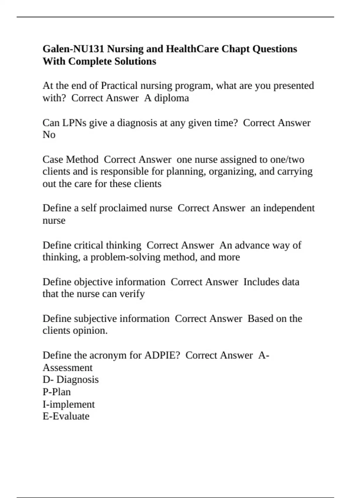 Define the acronym for ADPIE? Correct Answer A-