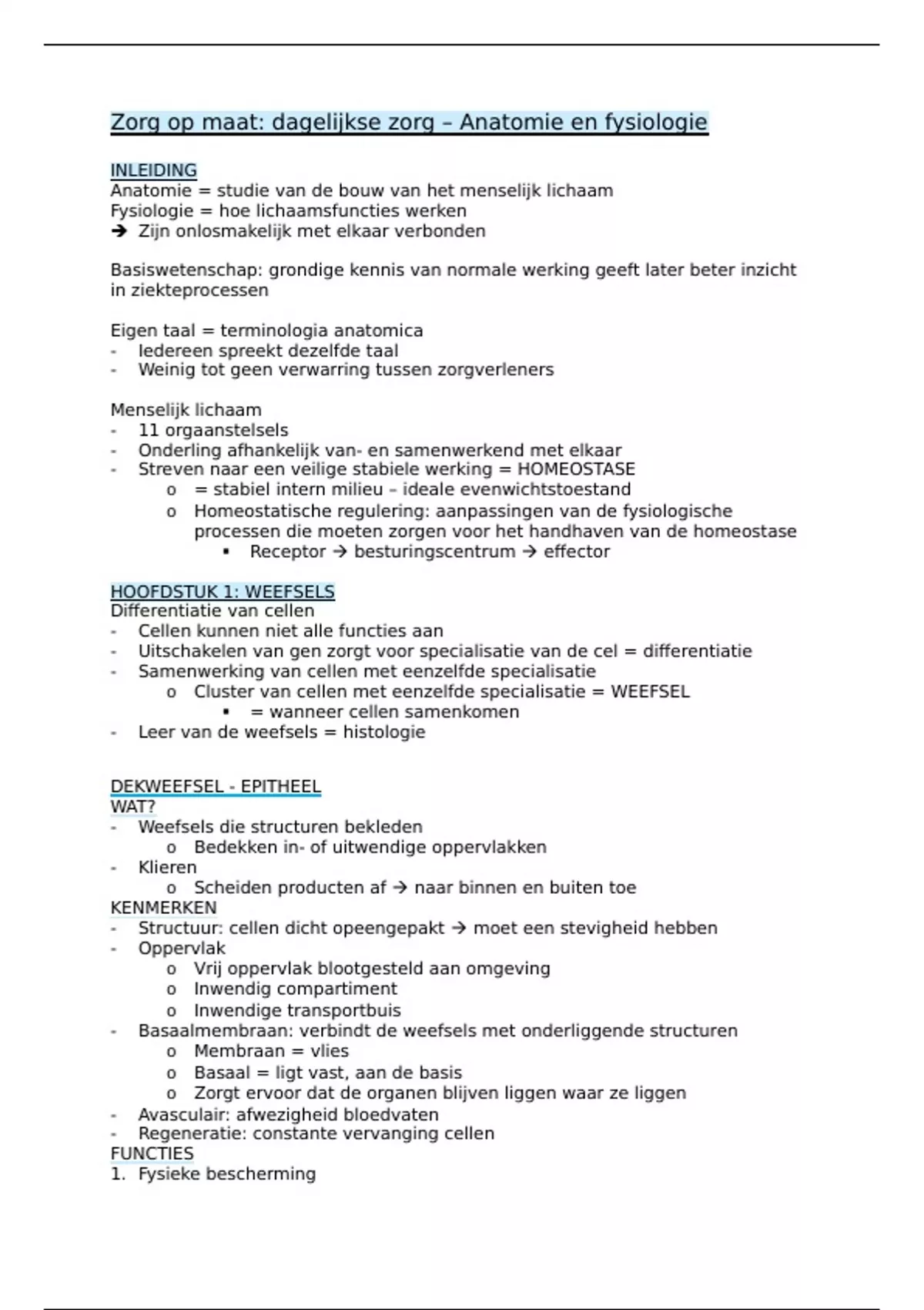 o Alle stoffen die het lichaam in-uit gaan moeten doorheen dekweefsel
