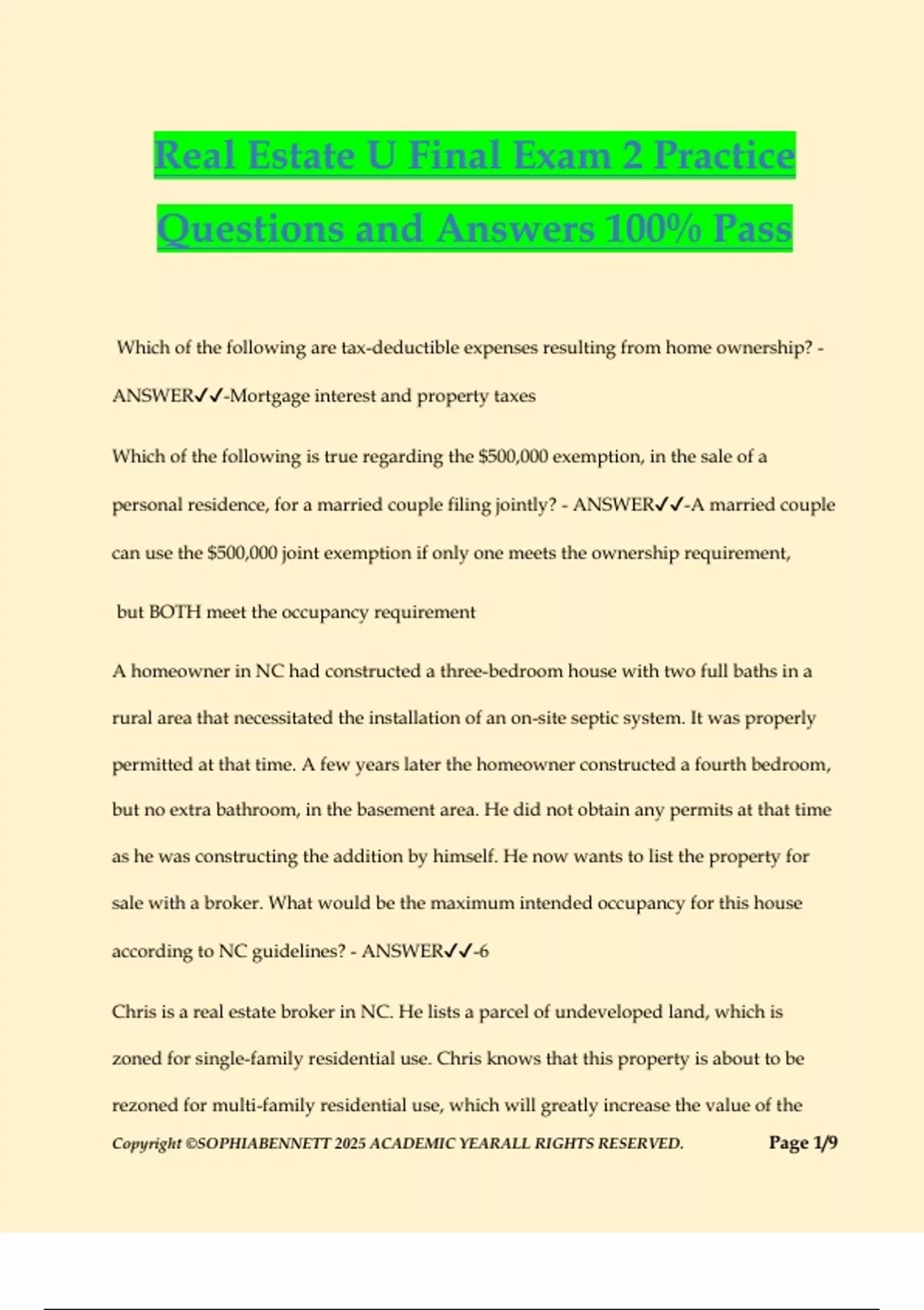 Real Estate U Final Exam 2 Practice Questions and Answers 100% Pass Which of the following are tax-deductible expenses resulting from home ownership? - ANSWER-Mortgage interest and property taxes Which of the following is true regarding the $500,000 exemption, in the sale of a personal residence, for a married couple filing jointly? - ANSWER-A married couple can use the $500,000 joint exemption if only one meets the ownership requirement, but BOTH meet the occupancy requirement A homeowner in NC had constructed a three-bedroom house with two full baths in a rural area that necessitated the installation of an on-site septic system. It was properly permitted at that time. A few years later the homeowner constructed a fourth bedroom, but no extra bathroom, in the basement area. He did not obtain any permits at that time as he was constructing the addition by himself. He now wants to list the property for sale with a broker. What would be the maximum intended occupancy for this house according to NC guidelines? - ANSWER-6 Chris is a real estate broker in NC. He lists a parcel of undeveloped land, which is zoned for single-family residential use. Chris knows that this property is about to be rezoned for multi-family residential use, which will greatly increase the value of the Copyright ©SOPHIABENNETT 2025 ACADEMIC YEARALL RIGHTS RESERVED. Page 2/9 property. Rather than informing the seller of this fact, Chris offers to buy the property at the listed price, telling the seller that he wants to acquire the property as a long-term investment. The deal closes. Several months later, after the rezoning had been accomplished, Chris sold the property for a $80,000 profit. The seller soon finds out about the profit Chris has made. What can the seller do in this case? - ANSWER- Notify the NCREC to impose disciplinary action Which of the following is an example of a blind ad? - ANSWER-Just listed! Home for sale. $250,000. Call Mary at for more information. A settlement meeting is usually conducted by a closing attorney. Who typically recommends the closing attorney? - ANSWER-The buyer or the buyer's lender A firm license is NOT required for which of the following? - ANSWER-a sole proprietorship James is a broker in NC and is also licensed as an attorney. He is buying a house and wants to rewrite part of the sales contract. Is James permitted to do so? - ANSWER- Yes. Since James is also an attorney and the buyer, he is permitted to rewrite parts of the contract. Samantha is a newly licensed provisional broker in NC who passed the licensing exam on July 12, 2021. In order to have her license remain on "Active" status, when must she complete 8 hours of continuing education? - ANSWER-By June 10 of 2023 Copyright ©SOPHIABENNETT 2025 ACADEMIC YEARALL RIGHTS RESERVED. Page 3/9 Sam is a non-provisional broker whose license is on "Active" status though he is not affiliated with a Broker in Charge (including himself). He is ONLY paid referral fees as he refers all real estate activities to other brokers. He maintains a public website where people can ask for information about the value of their home and Sam refers all of these questions to other "Active" brokers. Is Sam's website within the rules of the NCREC? - ANSWER-No Mark is a licensed broker in NC who owns several investment properties, which he rents out. He also provides property management services f