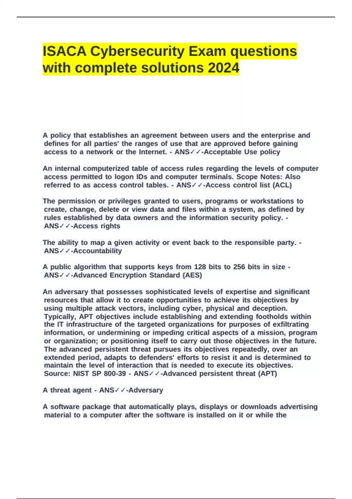 ISACA Cybersecurity Exam questions with complete solutions 2024.