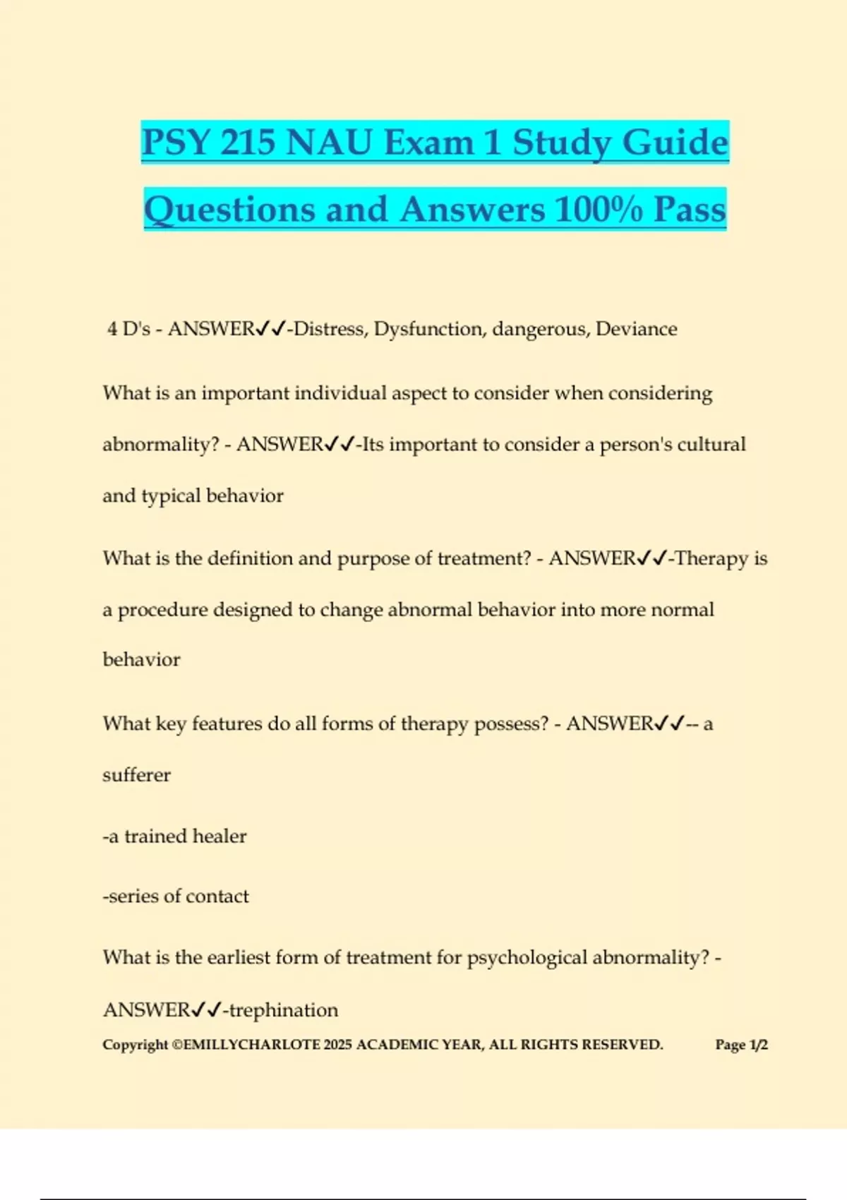 PSY 215 NAU Exam 1 Study Guide Questions and Answers 100% Pass 4 D's - ANSWER-Distress, Dysfunction, dangerous, Deviance What is an important individual aspect to consider when considering abnormality? - ANSWER-Its important to consider a person's cultural and typical behavior What is the definition and purpose of treatment? - ANSWER-Therapy is a procedure designed to change abnormal behavior into more normal behavior What key features do all forms of therapy possess? - ANSWER-- a sufferer -a trained healer -series of contact