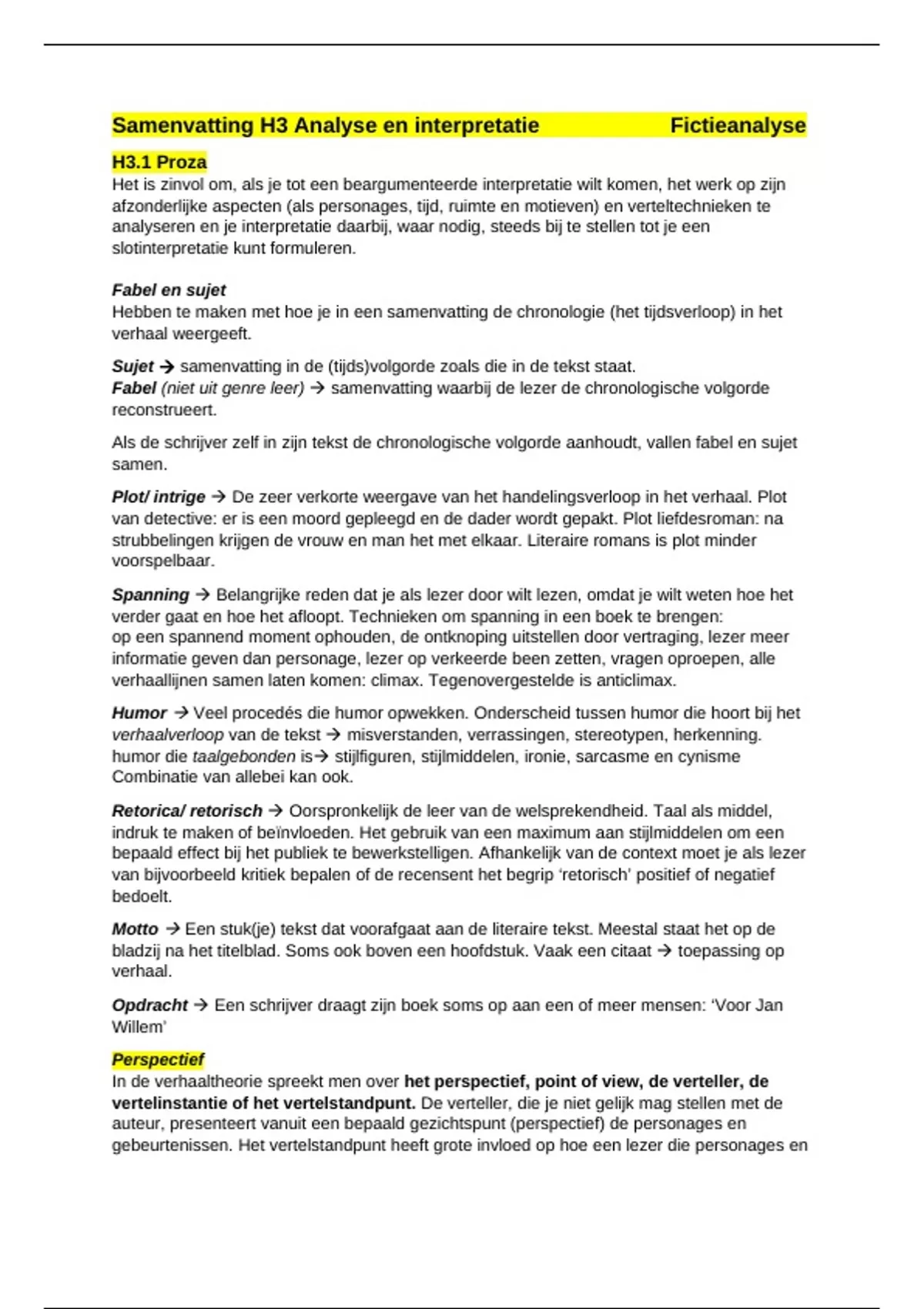 Samenvatting H3 Analyse en interpretatie Fictieanalyse H3.1 Proza Alle begrippen die belangrijk zijn voor de toets van fictieanalyse op de Fontys komen terug in deze samenvatting.