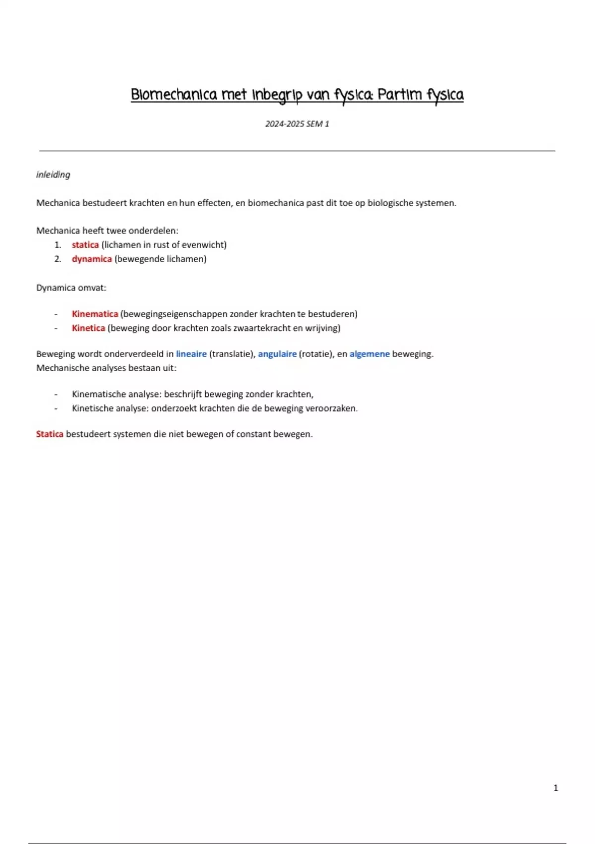 Dit is een volledige samenvatting van het vak 'Biomechanica met inbegrip van fysica’ PARTIM FYSICA, gedoceerd door Prof. Vanderstraeten. Met deze samenvatting haalde ik een 17/20 voor het partim fysica. De samenvatting omvat zowel de theorie als de belangrijkste punten uit de bijbehorende PowerPoint-presentaties. Ik hoop dat deze samenvatting je kan helpen :)