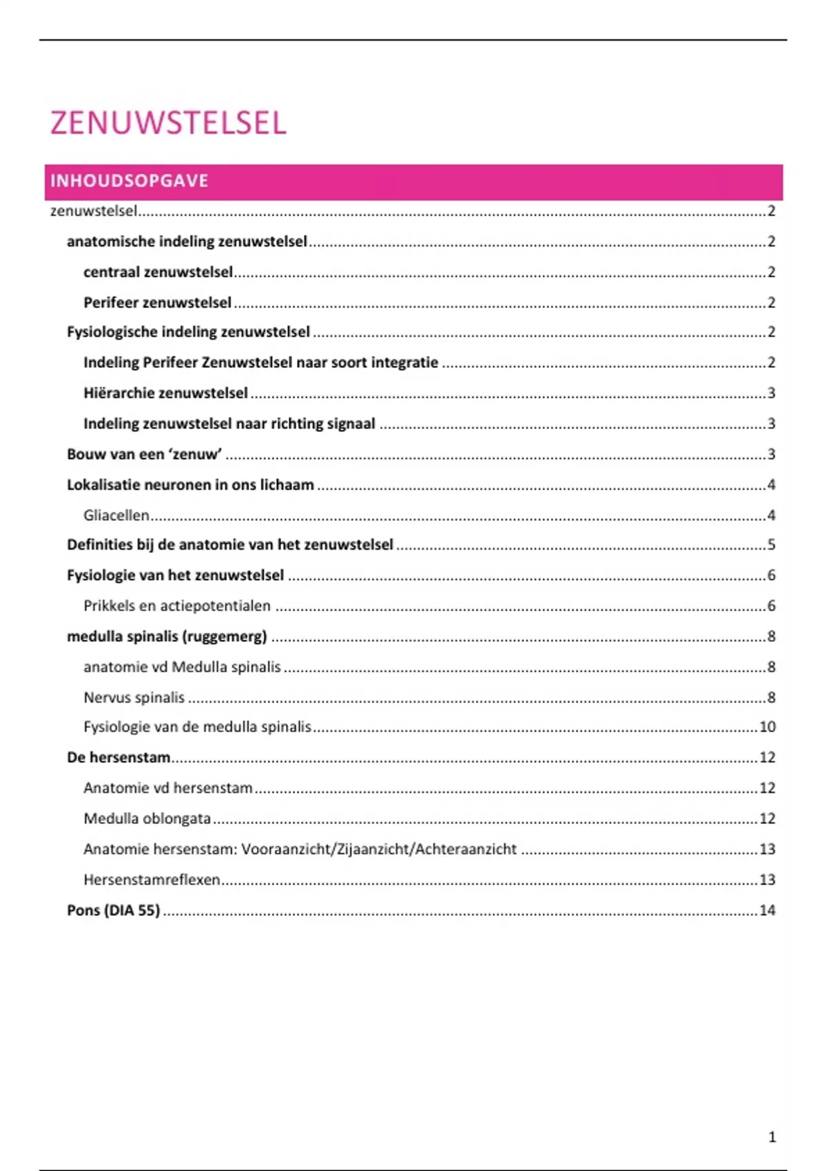 Samenvatting Zenuwstelsel Dit document bevat een uitgebreide en gestructureerde uitleg over het zenuwstelsel, inclusief de anatomie, fysiologie en indeling. Het behandelt onderwerpen zoals het centrale en perifere zenuwstelsel, zenuwcellen, reflexen, pijnfysiologie, hersenfuncties en meer. Perfect voor studenten die een gedetailleerd overzicht nodig hebben voor hun studie vroedkunde, verpleegkunde, of andere gezondheidsstudies. Alles is helder en overzichtelijk uitgelegd met relevante termen en indelingen die belangrijk zijn voor examens.