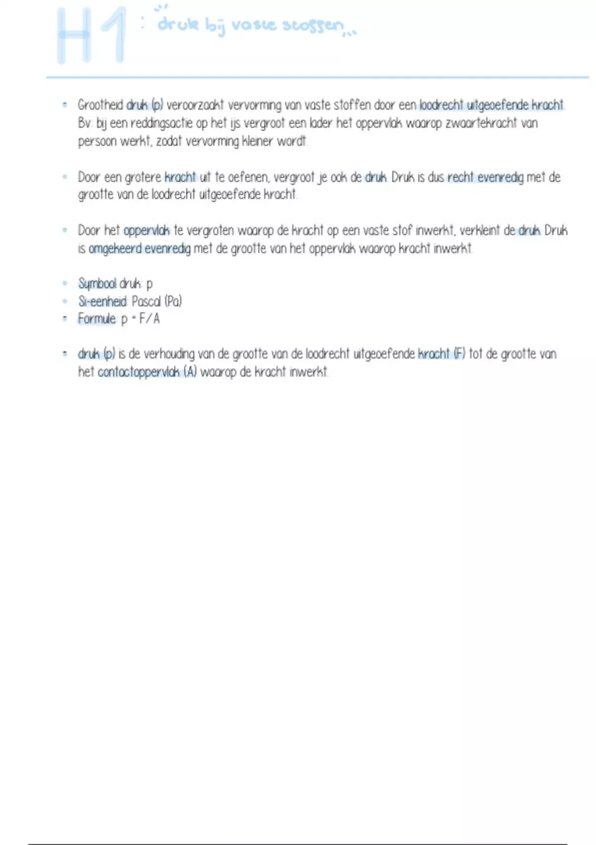 • druk (p) is de verhouding van de grootte van de loodrecht uitgeoefende kracht (F) tot de grootte van