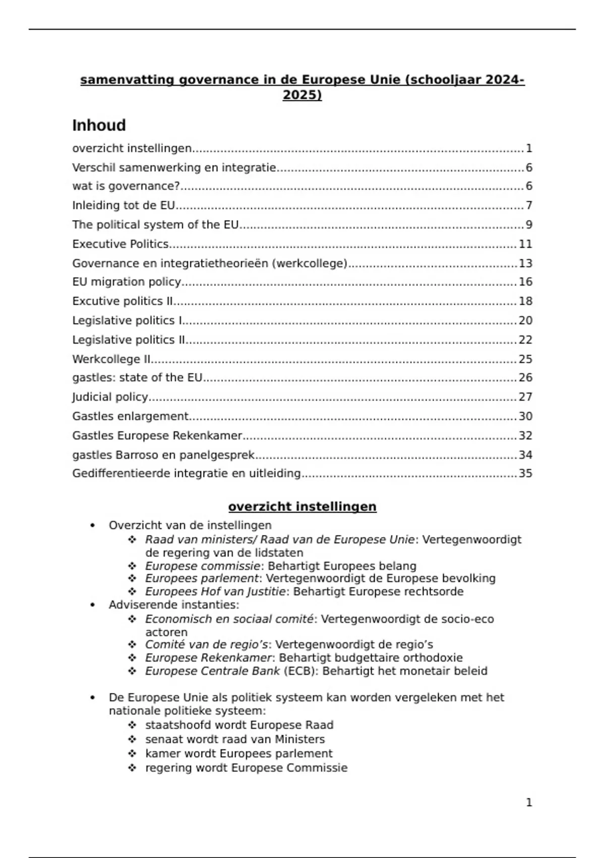 samenvatting governance in de Europese Unie (schooljaar 2024-