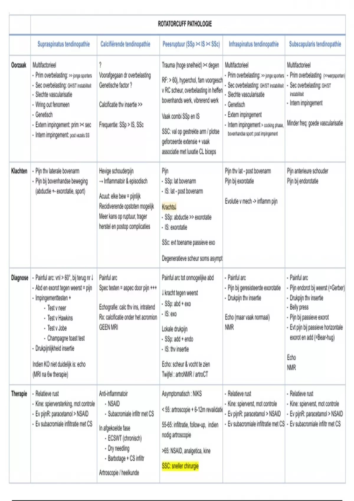 Supraspinatus tendinopathie Calcifiërende tendinopathie Peesruptuur (SSp >< IS >< SSc) Infraspinatus tendinopathie Subscapularis tendinopathie
