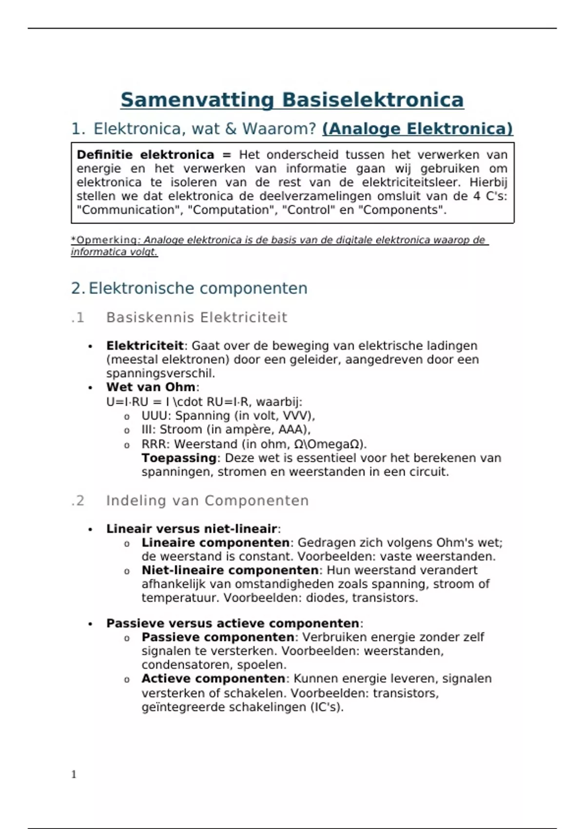 Samenvatting Basiselektronica - 1BA IW - VUB
