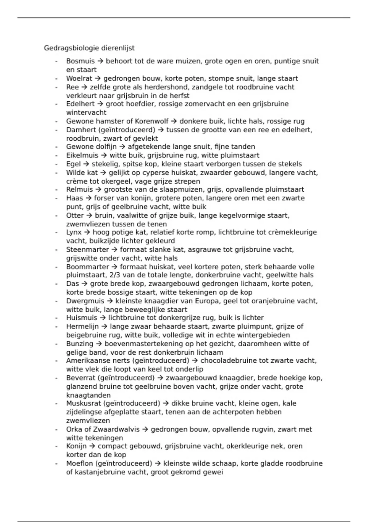 Samenvatting Te kennen diersoortenlijst met kenmerken per soort Gedragsbiologie